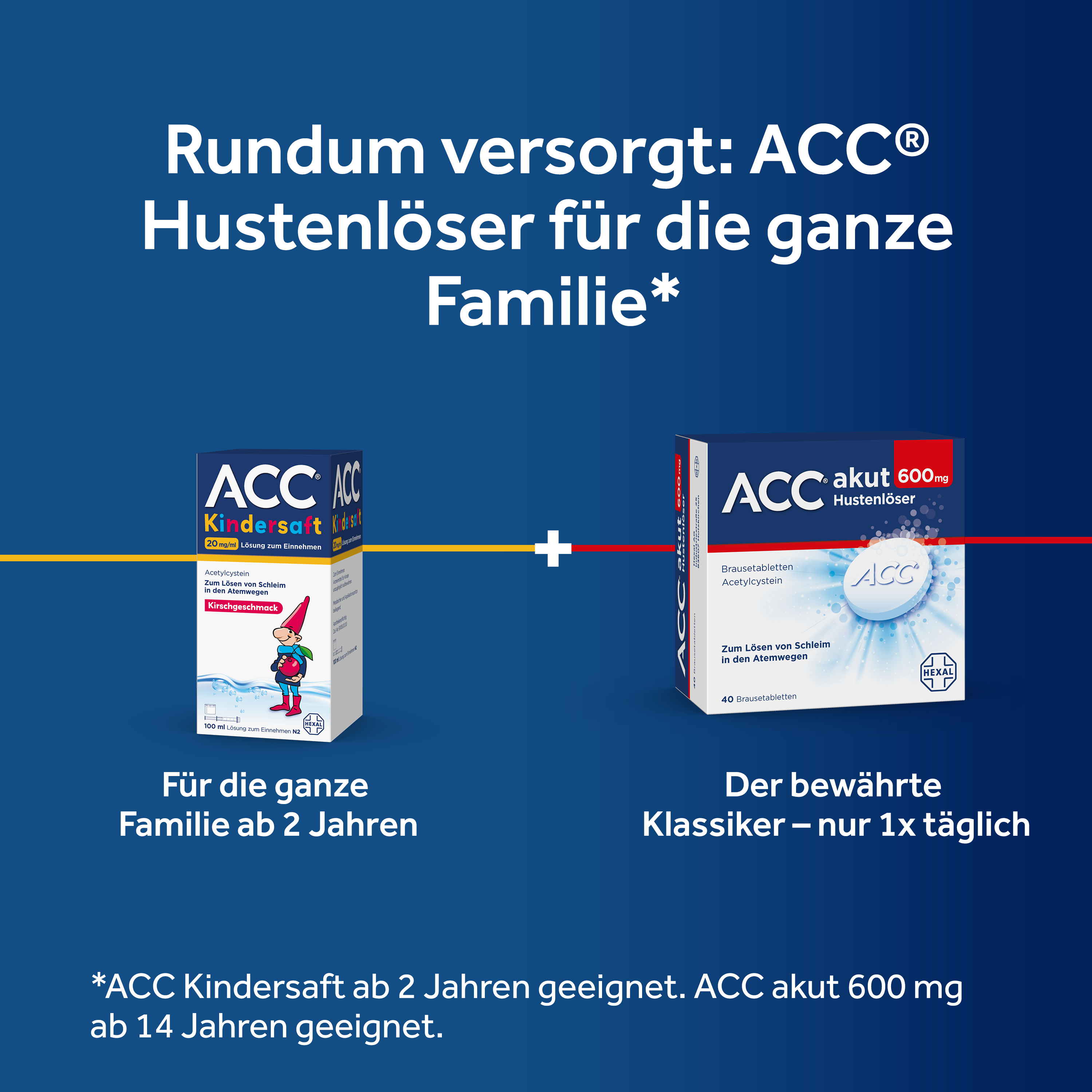 Gerade für Kinder kann Husten, besonders Husten mit festsitzendem Schleim, sehr belastend sein. Kann der Schleim nicht abgehustet werden, kann ein Hustenlöser wie der ACC Kindersaft Abhilfe schaffen. ACC Kindersaft mit Kirschgeschmack wird angewendet zur Schleimlösung und zum erleichterten Abhusten bei Atemwegserkrankungen mit zähem Schleim. Es handelt sich um eine gebrauchsfertige Lösung für Kinder ab 2 Jahren.