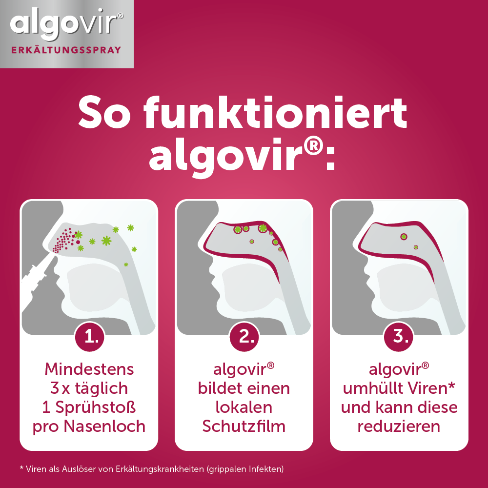 Der naturbasierte Wirkstoff Carragelose® in algovir® bildet einen Schutzfilm auf der Nasenschleimhaut, der diese Viren umhüllt und sie so daran hindert, in die Schleimhaut einzudringen und sich dort zu vermehren. algovir® kann dadurch den vollständigen Erkältungsausbruch verhindern und selbst bei einer bereits bestehenden Erkältung die Symptome lindern und die Erkältungsdauer verkürzen