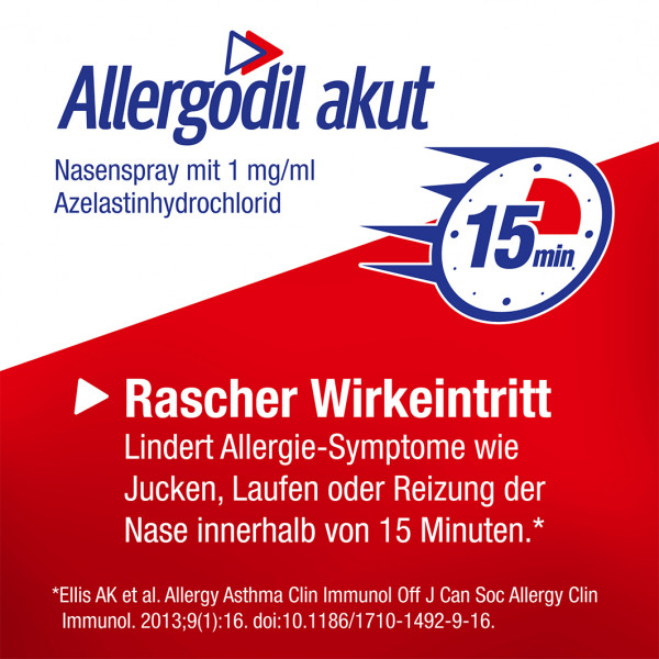 Das Allergodil akut Nasenspray mit dem Wirkstoff Azelastinhydrochlorid kann bei diesen Allergiebeschwerden schnelle und langanhaltende Linderung verschaffen. Der Wirkstoff hemmt das bei einer Allergie vermehrt ausgeschütteten Histamin und andere entzündlich wirkende Stoffe, die bei einer Allergie vermehrt freigesetzt werden. Dadurch werden unter anderem übermäßige Nasensekretion, quälender Niesreiz und Schwellungen der Nasenschleimhaut gehemmt. Da Allergodil akut Nasenspray direkt auf die Nasenschleimhaut einwirkt, werden trotz der geringen Wirkstoffdosierung die allergischen Beschwerden an der Nase schnell und wirksam vermindert.