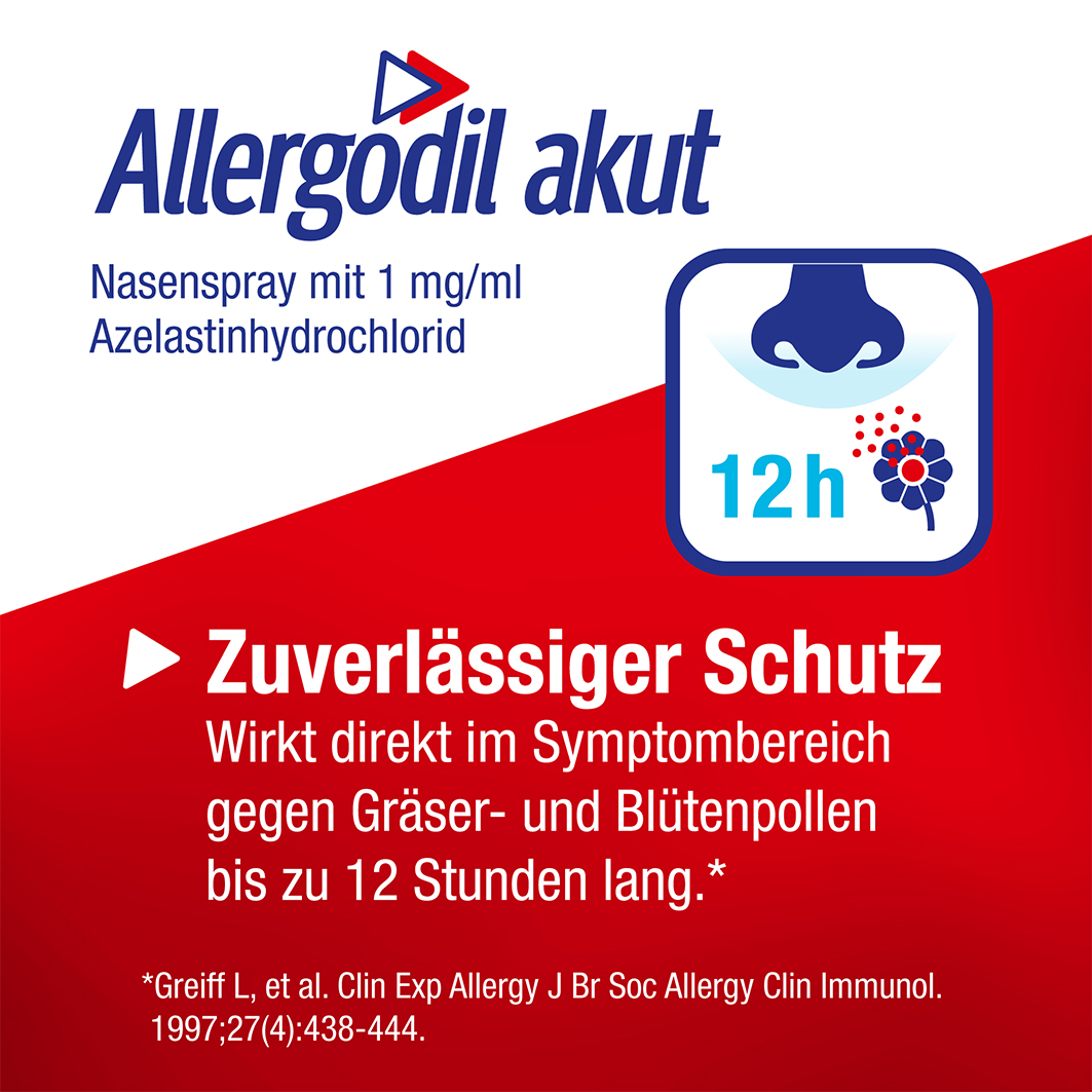 Das Allergodil akut Nasenspray mit dem Wirkstoff Azelastinhydrochlorid kann bei diesen Allergiebeschwerden schnelle und langanhaltende Linderung verschaffen. Der Wirkstoff hemmt das bei einer Allergie vermehrt ausgeschütteten Histamin und andere entzündlich wirkende Stoffe, die bei einer Allergie vermehrt freigesetzt werden. Dadurch werden unter anderem übermäßige Nasensekretion, quälender Niesreiz und Schwellungen der Nasenschleimhaut gehemmt. Da Allergodil akut Nasenspray direkt auf die Nasenschleimhaut einwirkt, werden trotz der geringen Wirkstoffdosierung die allergischen Beschwerden an der Nase schnell und wirksam vermindert.