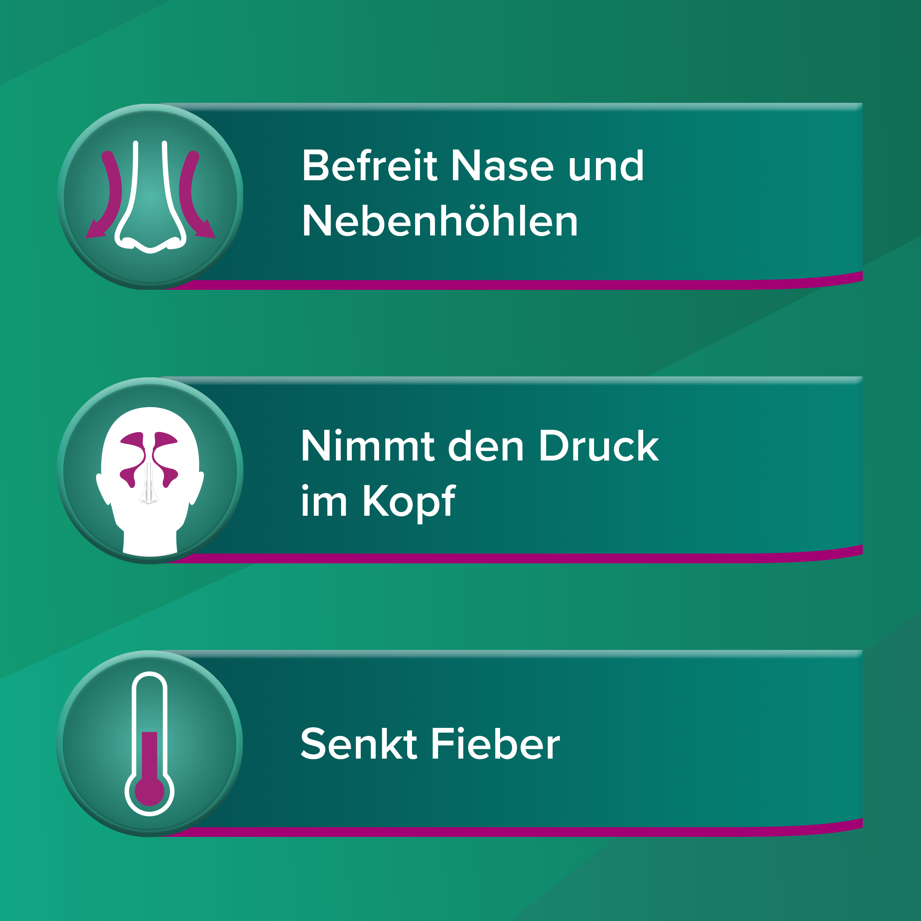 - Es wird angewendet zur Kurzzeitbehandlung der Symptome einer akuten viralen Rhinosinusitis (verstopfte Nase und Nebenhöhlen), die mit Druckgefühl, Kopfschmerzen und/oder Fieber einhergehen.