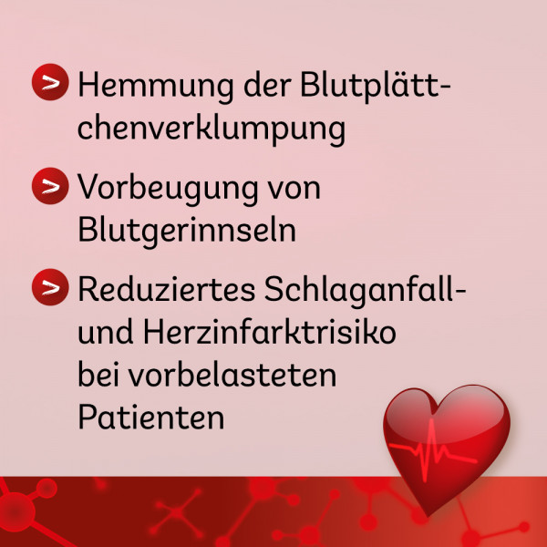 - zur Vorbeugung von vorübergehender Mangeldurchblutung im Gehirn (TIA: transitorischen ischämischen Attacken) und Hirninfarkten, nachdem Vorläuferstadien (z.B. vorübergehende Lähmungserscheinungen im Gesicht oder der Armmuskulatur oder vorübergehender Sehverlust) aufgetreten sind.