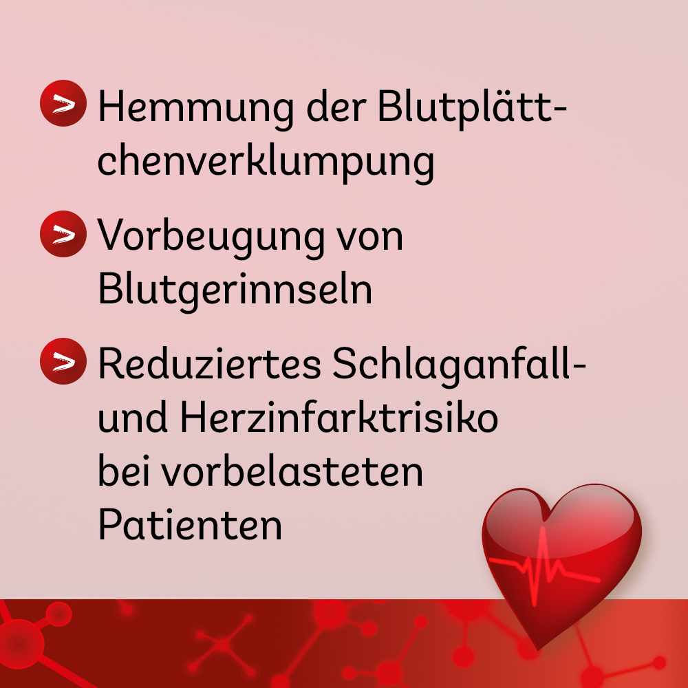 Auch die Blutgerinnung wird durch Acetylsalicylsäure beeinflusst. Die Substanz verhindert, dass die Blutplättchen (Thrombozyten) zusammenklumpen und verbessert so die Fließfähigkeit des Blutes.