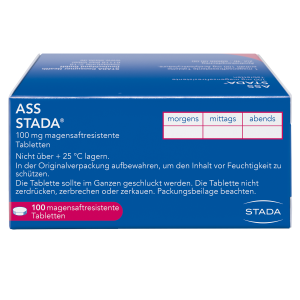 ASS STADA® 100 mg magensaftresistente Tabletten mit dem Wirkstoff Acetylsalicylsäure · Behandlung als Blutplättchenaggregationshemmer · Tabletten enthalten 100 mg Acetylsalicylsäure So wirken ASS STADA® 100 mg magensaftresistente Tabletten Die ASS STADA® 100 mg magensaftresistenten Tabletten enthalten Acetylsalicylsäure, welche als Wirkstoff gegenüber Thrombozyten aggregationshemmend wirkt. Als „Thrombozyten“ werden sehr kleine Zellen im Blut bezeichnet, die das Blut zum Gerinnen bringen können. Solche „Blutgerinnsel“ können bei Herzerkrankungen oder bei Patienten mit Schlaganfall in der Vorgeschichte gravierende Folgen haben.