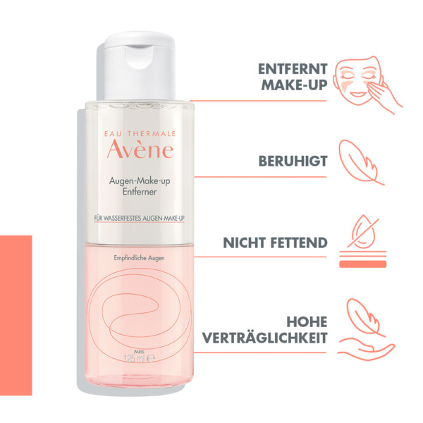 Der Avène Augen-Make-up-Entferner für wasserfestes Augen-Make-up entfernt sanft Make-up, beruhigt die Haut und ist besonders für empfindliche Augen, KontaktlinsenträgerInnen und gereizte Augenlider geeignet.