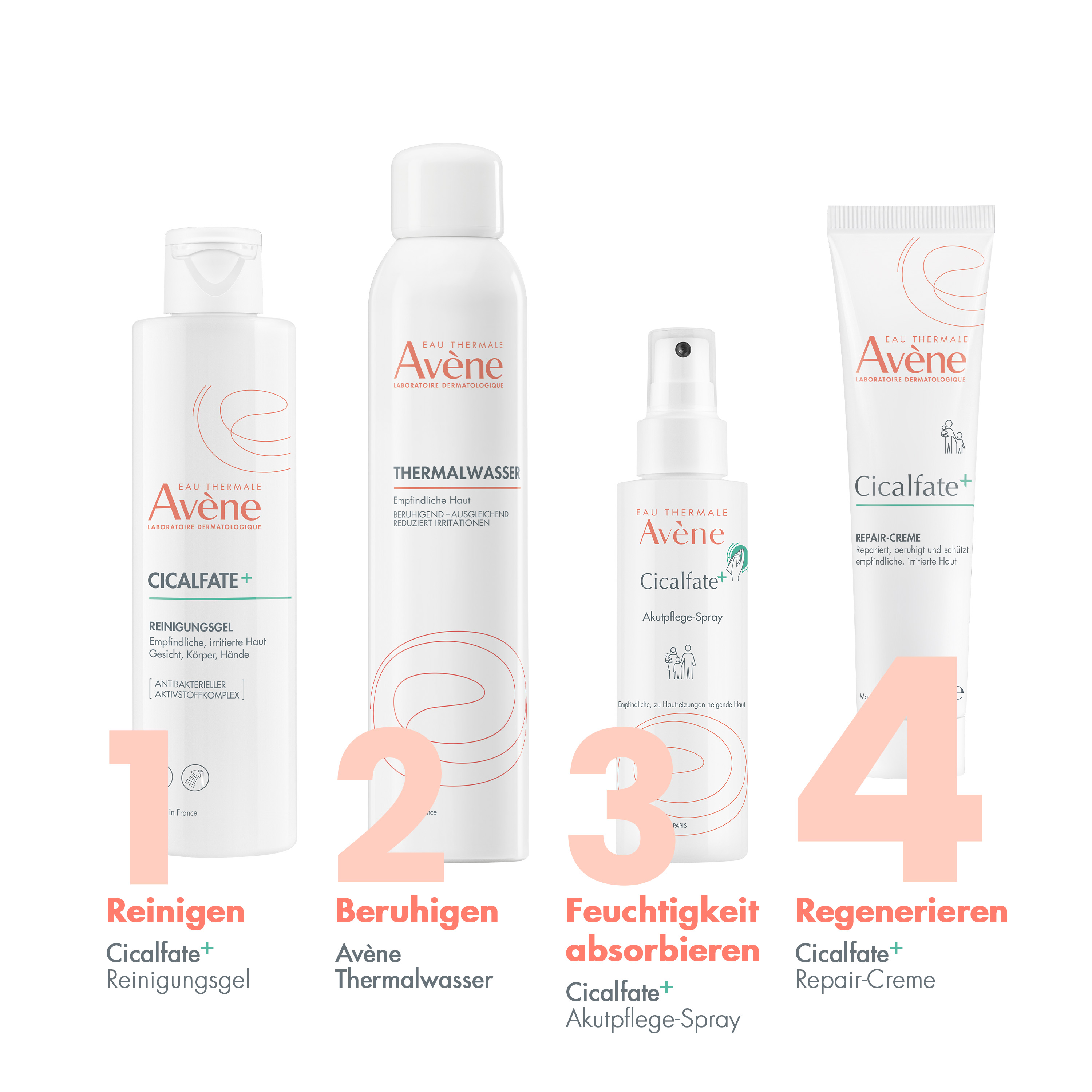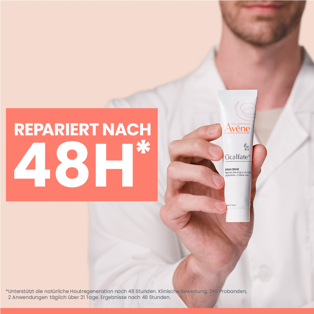 Die Cicalfate+ Repair-Creme enthält den innovativen postbiotischen Aktivstoff [C+-Restore]™, der aus Avène Thermalwasser gewonnen wird. Dieser einzigartige Inhaltsstoff unterstützt und beschleunigt die Hautregeneration. In einer Studie dauerte die Wundheilung bei Behandlung mit der Creme im Durchschnitt nur 12,65 Tage. Die Wunden der unbehandelten Vergleichsgruppe brauchten hingegen 16,5 Tage zur Heilung.*** Die Cicalfate+ Repair-Creme bewirkt also ein deutlich schnelleres Abheilen.