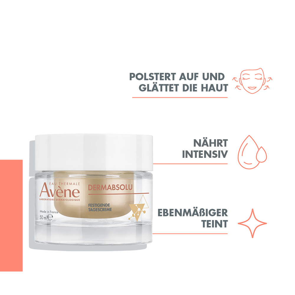 Avène DERMABSOLU wirkt 3 klinischen Zeichen der Hautalterung entgegen: Die Gesichtskonturen werden gestrafft, die Haut wird intensiv genährt, und der Teint ist strahlend.