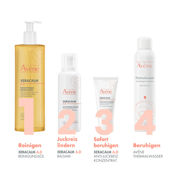 XERACALM A.D Rückfettendes Reinigungsöl reinigt sanft und beruhigt sehr trockene, zu Neurodermitis und Juckreiz neigende Haut. Als erster Schritt in der Anti-Juckreiz-Routine macht das rückfettende Reinigungsöl die Haut weich und komfortabel und schont das Mikrobiom der Haut. Das rückfettende Reinigungsöl ist seifenfrei und hat einen physiologischen pH-Wert, so dass es bei Entzündungen im Gesicht, am Körper und auf der Kopfhaut angewendet werden kann. Parfümfrei und so formuliert, dass das Risiko allergischer Reaktionen minimiert wird, brennt XeraCalm A.D Rückfettendes Reinigungsöl nicht in den Augen und ist ideal für die Haut von Neugeborenen, Kindern und Erwachsenen. Die Formulierung beinhaltet den ersten postbiotischen Aktivstoff aus dem Avène Thermalwasser, I-modulia®, der Juckreiz* reduziert, die Abwehrkräfte der Haut stimuliert und Irritationen bekämpft, mit Cer-omega, hautähnlichen Lipiden, die Trockenheit entgegen wirken und die Hautbarriere wiederherstellen, und Avène Thermalwasser, das auf natürliche Weise beruhigend, ausgleichend und stärkend wirkt. *in Verbindung mit trockener Haut