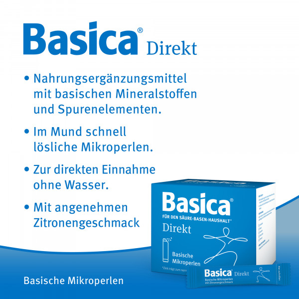 Basica Direkt® ist ideal für die schnelle Einnahme zu Hause, unterwegs, im Büro oder beim Sport. Die basischen Mikroperlen schmecken erfrischend nach Zitrone und lösen sich schnell im Mund auf.