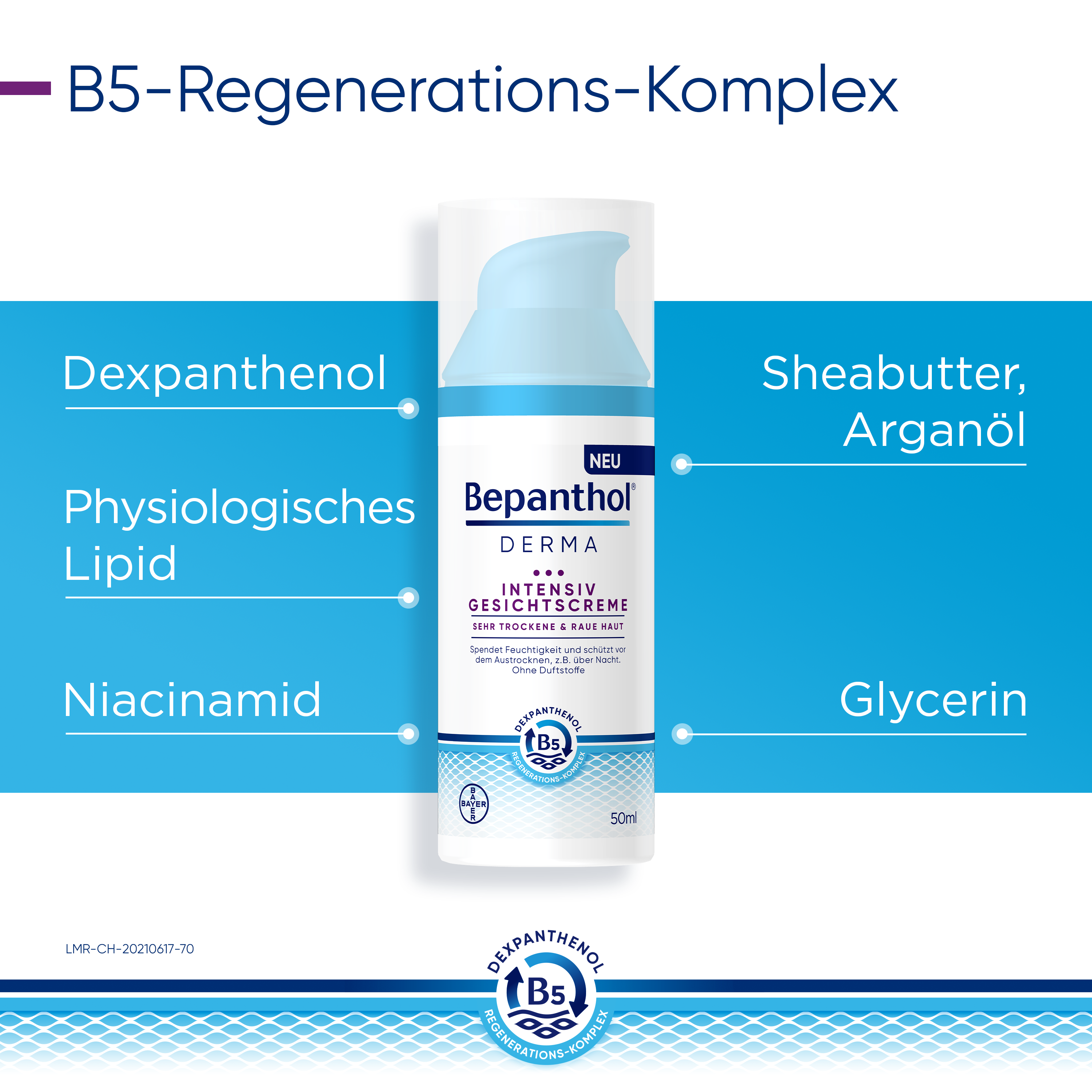 Die Wirksamkeit und Verträglichkeit der Bepanthol® DERMA Intensiv Gesichtscreme ist klinisch geprüft. Die Creme ist nicht komedogen. 90 % der Inhaltsstoffe sind natürlichen Ursprungs.