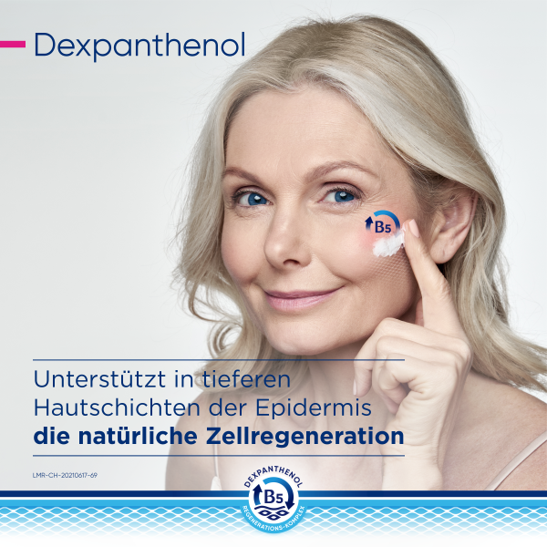 Der B5-Regenerations-Komplex unterstützt die Regeneration der Haut – von innen nach außen. Dabei fördert Dexpanthenol in tieferen Hautschichten der Epidermis die natürliche Zellregeneration. Das enthaltene Glycerin spendet sofortige und lang anhaltende Feuchtigkeit. Niacinamid (Vitamin B3) beruhigt juckende, trockene Haut und natürliche Lipide wie Sheabutter und Arganöl ergänzen fehlende Hautlipide. Das physiologische Lipid unterstützt zusätzlich die Anordnung der Doppellipidschicht.