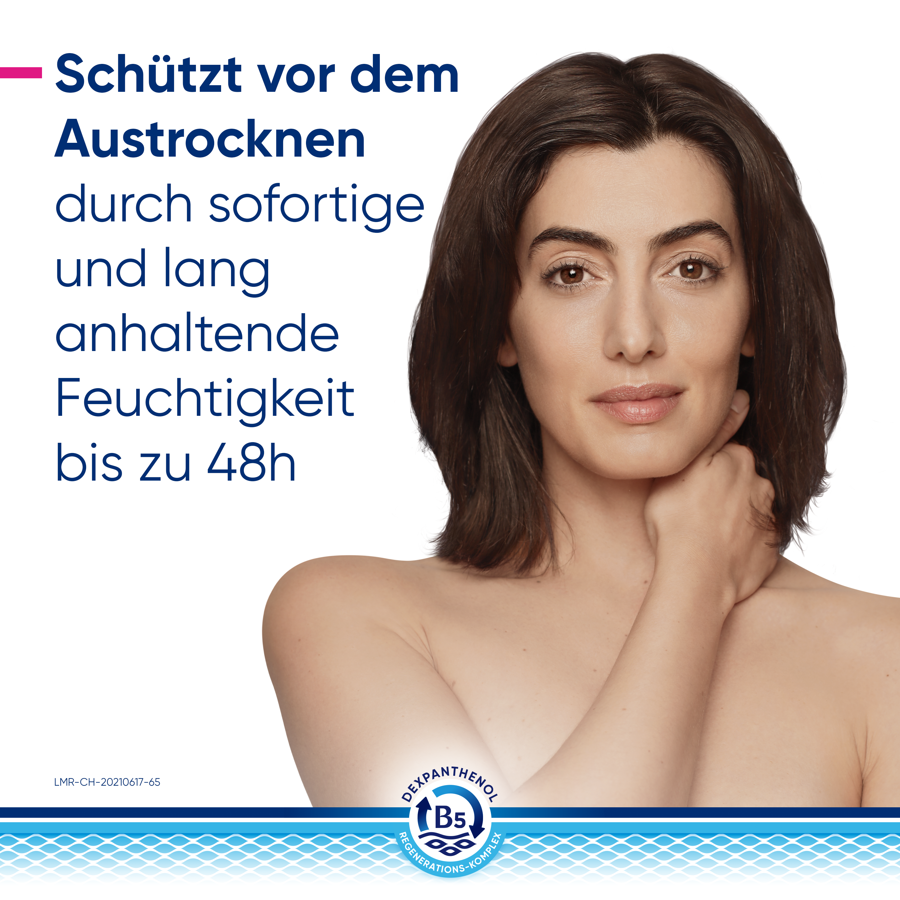 • Regenerierende Körperlotion. Sie pflegt intensiv und zieht schnell ein. Sie schützt vor dem Austrocknen durch sofortige und lang anhaltende Feuchtigkeit (bis zu 48h) – für zarte und geschmeidige Haut. Sie ist perfekt geeignet für empfindliche und sehr trockene Haut.