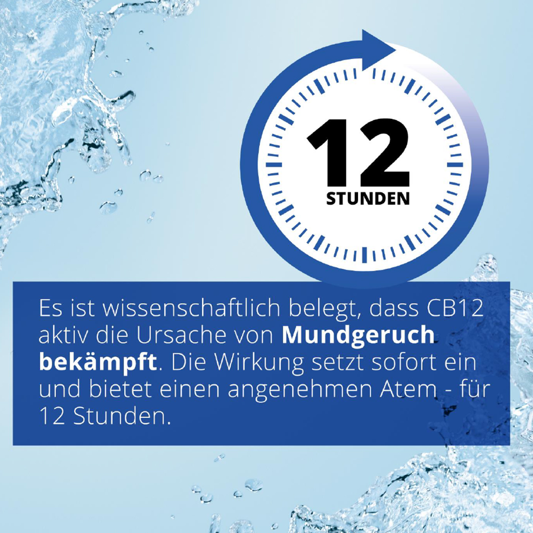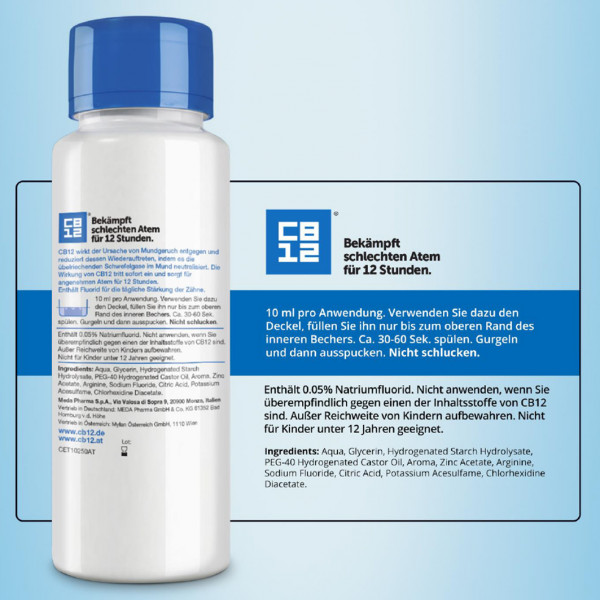 Das Produkt enthält 0,3% Zink, 0,025% Chlorhexidin und 0,05% Natriumfluorid. CB12 schmeckt frisch nach Minze und Menthol.
