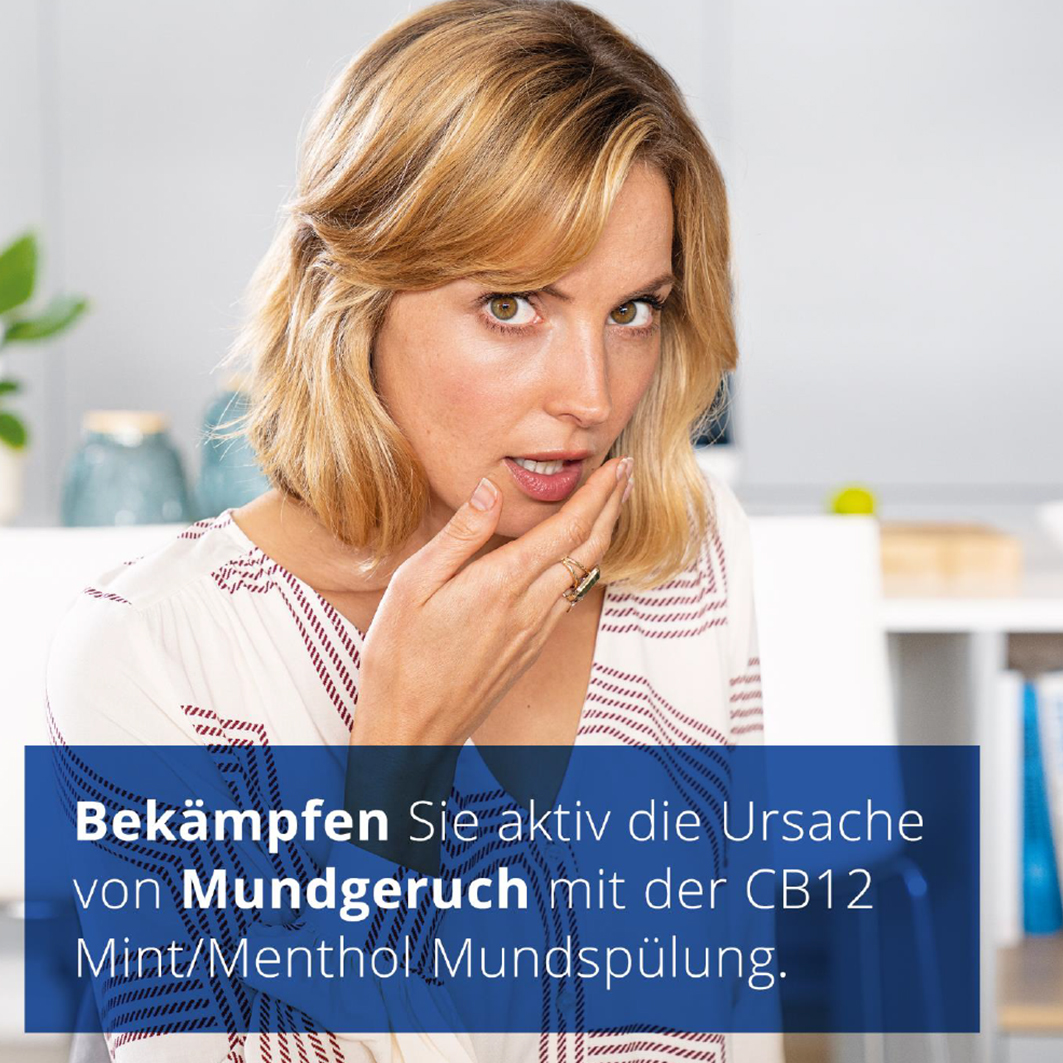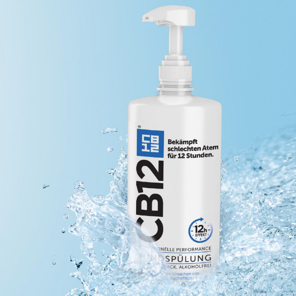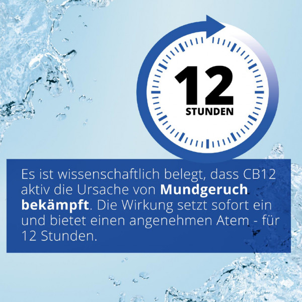 Bekämpfen Sie die Ursache von Mundgeruch mit der CB12 Mundspülung. CB12 ist eine frei verkäufliche Mundspülung, die zwei Hauptbestandteilen enthält: Zinkacetat (0,3 Prozent) und Chlorhexidin (0,025 Prozent). Diese synergetisch wirkende Kombination in unserer CB12 Mundspülung bekämpft die Ursache von Mundgeruch für bis zu 12 Stunden! Regelmäßiges Spülen mit einer Mundspülung ist ein grundlegender Bestandteil einer guten Mundhygiene-Routine, um Mundgeruch zu behandeln - zusammen mit korrektem Zähneputzen und der Verwendung von Zahnseide. Es ist wissenschaftlich erwiesen, dass in 90 Prozent der Fälle von Mundgeruch die Ursache in einer Bakterienansammlung liegt. Diese pathologische Anhäufung kann in den Zahnzwischenräumen, in den Zahnfleischtaschen und insbesondere auf dem Zungenrücken stattfinden. Die Bakterien produzieren dann flüchtige Schwefelverbindungen (VSC), die als unangenehm riechende Gase hauptsächlich für Mundgeruch verantwortlich sind.