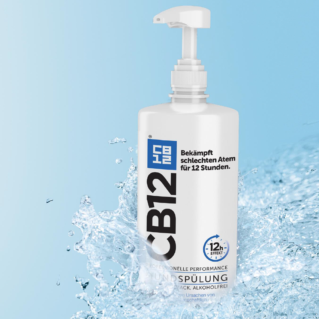 - Nach dem Zähneputzen 30 bis 60 Sekunden lang mit 10 ml CB12 Mundspülung reinigen, gurgeln und dann ausspucken. Nicht schlucken. Genießen Sie 12 Stunden lang einen angenehmen Atem!