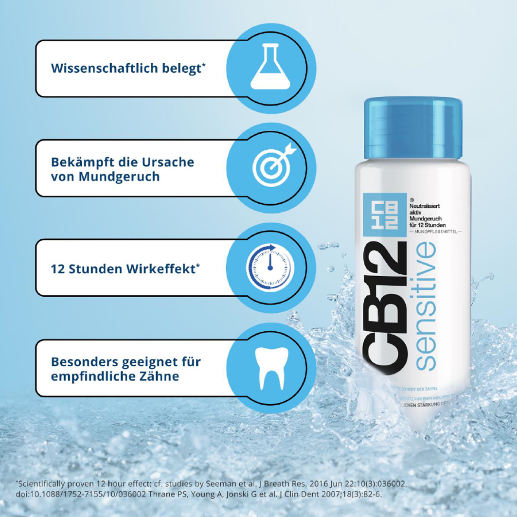 Die Bakterien produzieren dort flüchtige Schwefelverbindungen (VSC). Die entstehenden Gase sind dabei größtenteils für den Mundgeruch verantwortlich. Durch zu aggressive Mundhygiene, Zahnsteinbildungen oder Zahnfleischrückgang können die Dentinkanälchen an den Zähnen frei liegen. Ist dies der Fall, erzeugen Zugluft, Wärme, Kälte oder süßes bzw. saures Essen Reize, welche direkt an den Zahnnerv geleitet werden. Das kann zu ziehenden oder stechenden Schmerzen führen. CB12 Sensitive Mundspülung sorgt für frischen Atem bei sensiblen Zähnen und empfindlichen Zahnfleisch. Es hilft dabei, einen Schutzschild um freiliegende Dentinkanälchen aufzubauen, verleiht Ihnen Atemfrische und stärkt Ihren Zahnschmelz.