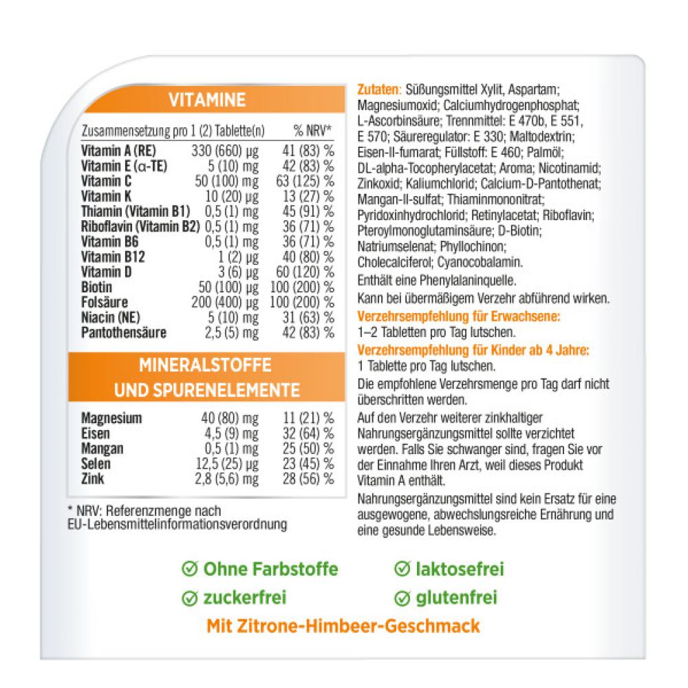 Süßungsmittel Xylit, Magnesiumoxid, Calciumhydrogenphosphat, L-Ascorbinsäure, Säureregulator: E 330; Maltodextrin, Emulgatoren: E 470b, E 570; Trennmittel: E 551; Eisen-II-fumarat, Füllstoff: E 460; Palmöl, DL-alpha-Tocopherylacetat, Aroma, modifizierte Stärke, Nicotinamid, Zinkoxid, Kaliumchlorid, Calcium-D-Pantothenat, Süßungsmittel Aspartam (enthält eine Phenylalaninquelle - kann bei übermäßigem Verzehr abführend wirken), Gelatine, Mangan-II-sulfat, Stärke, Thiaminmononitrat, Pyridoxinhydrochlorid, Retinylacetat, Riboflavin, Pteroylmonoglutaminsäure, D-Biotin, Natriumselenat, Antioxidationsmittel: E 321; Phyllochinon, Cholecalciferol, Cyanocobalamin.