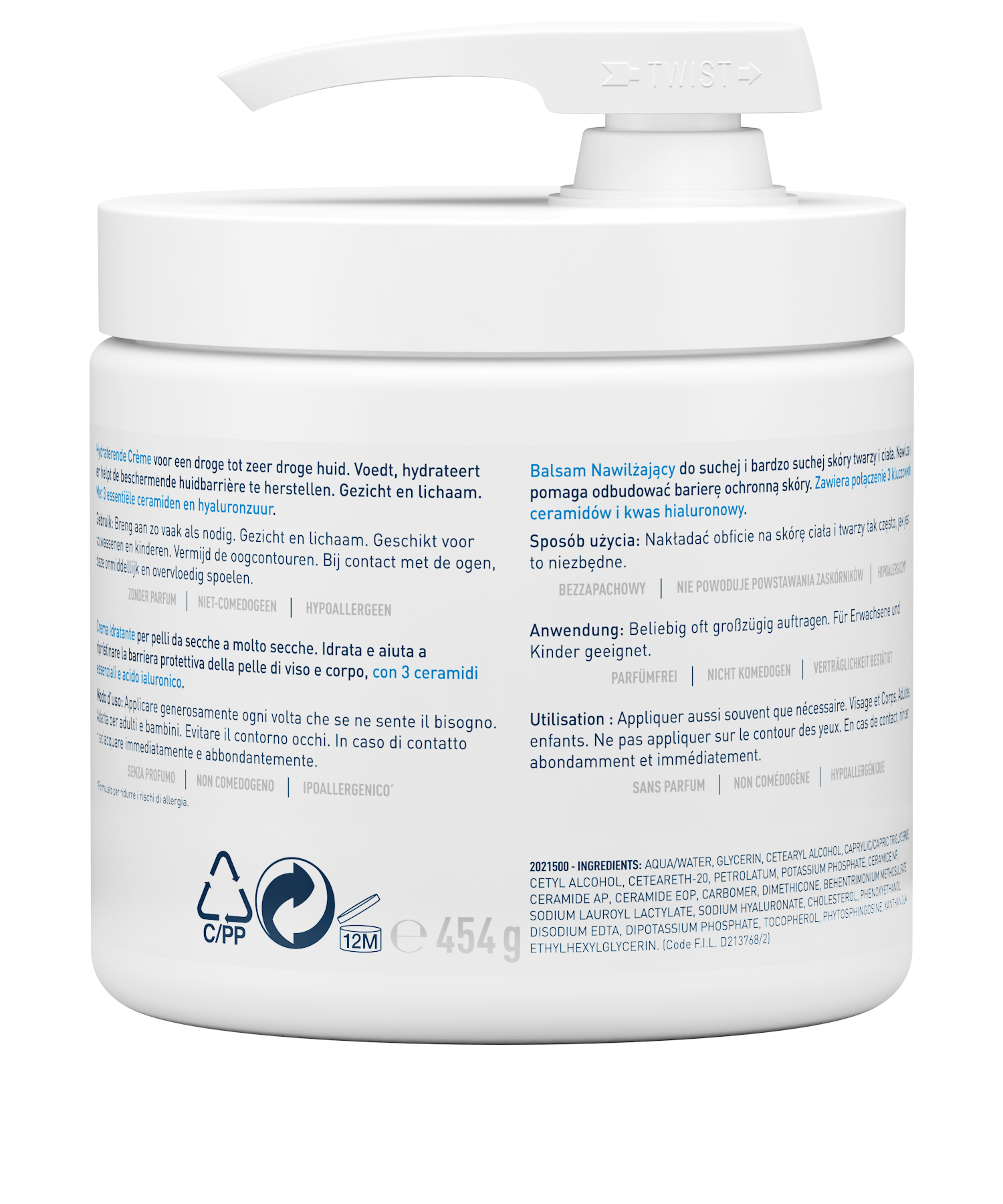 AQUA / WATER • GLYCERIN • CETEARYL ALCOHOL • CAPRYLIC/CAPRIC TRIGLYCERIDE • CETYL ALCOHOL • CETEARETH-20 • PETROLATUM • DIMETHICONE • PHENOXYETHANOL • BEHENTRIMONIUM METHOSULFATE • POTASSIUM PHOSPHATE • ETHYLHEXYLGLYCERIN • SODIUM LAUROYL LACTYLATE • DISODIUM EDTA • DIPOTASSIUM PHOSPHATE • CERAMIDE NP • CERAMIDE AP • PHYTOSPHINGOSINE • CHOLESTEROL • XANTHAN GUM • CARBOMER • SODIUM HYALURONATE • TOCOPHEROL • CERAMIDE EOP