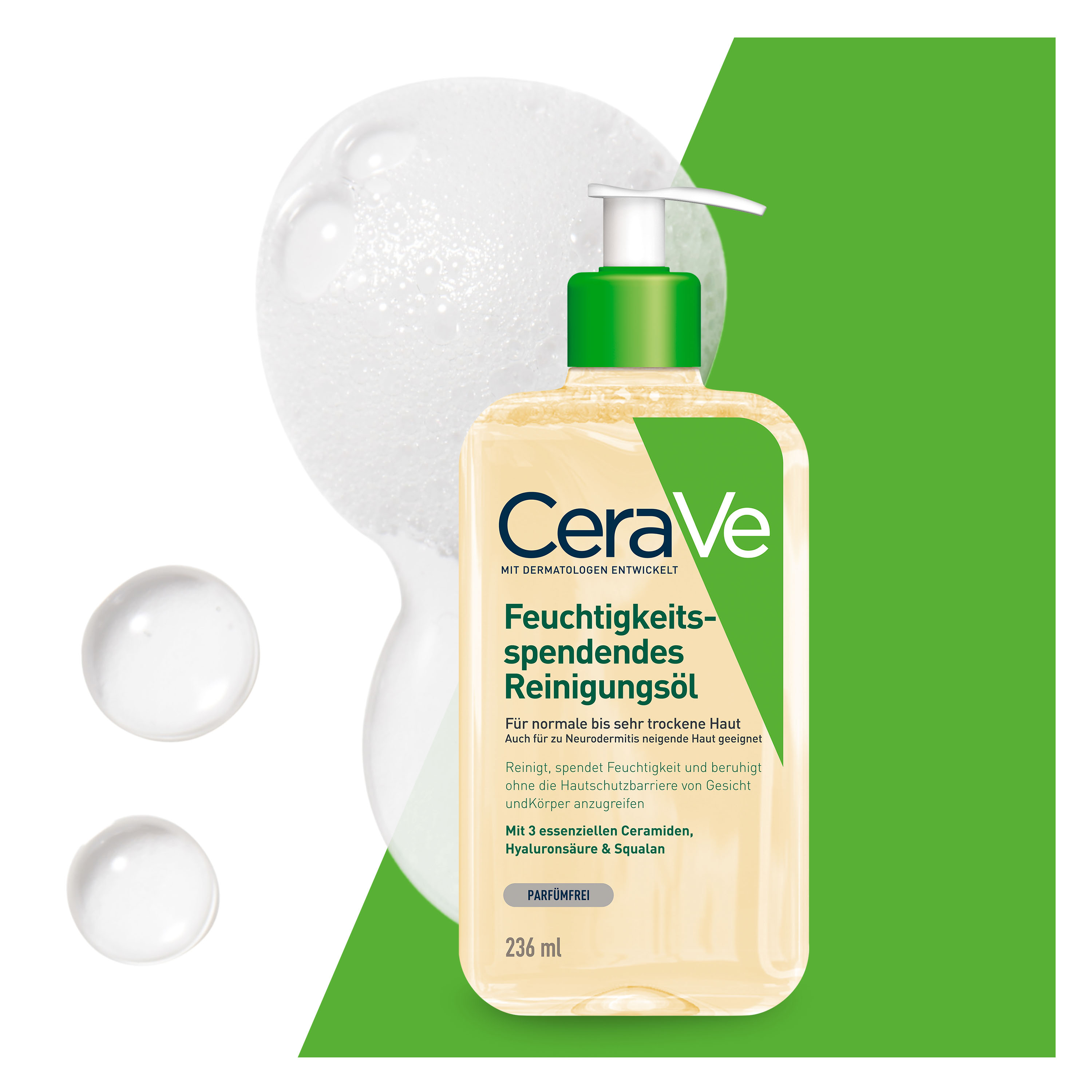 Reinigungsöl für normale bis sehr trockene Haut von Körper und Gesicht Das schäumende Reinigungsöl von CeraVe reinigt die Haut effektiv, spendet wertvolle Feuchtigkeit und schützt die natürliche Hautschutzbarriere. CeraVe Feuchtigkeitsspendendes Reinigungsöl ohne Duftstoff und Seife Die mit Dermatologen entwickelte Formel enthält rückfettendes Squalan, Triglyceride sowie Ceramide, die die Haut bereits ab der ersten Anwendung regenerieren und mit Feuchtigkeit versorgen. Der samtige Schaum, der beim Auftragen entsteht, entfernt selbst hartnäckiges Make-up und Schmutz, ohne die Haut auszutrocknen. Es eignet sich für die ganze Familie, für Allergiker sowie für zu Neurodermitis neigende Haut.