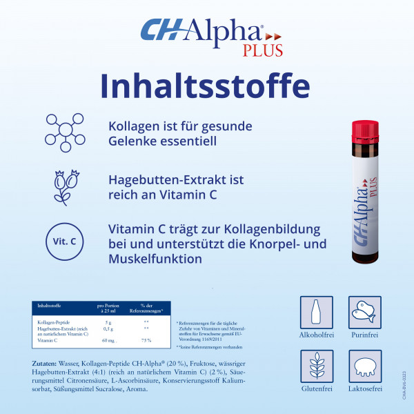 - GEZIELTE VERSORGUNG DER GELENKKNORPEL: Die speziellen Kollagen-Peptide in CH-Alpha® PLUS wirken gezielt in den Kollagenstrukturen der Gelenke und Bandscheiben und können besonders gut vom Körper aufgenommen werden.