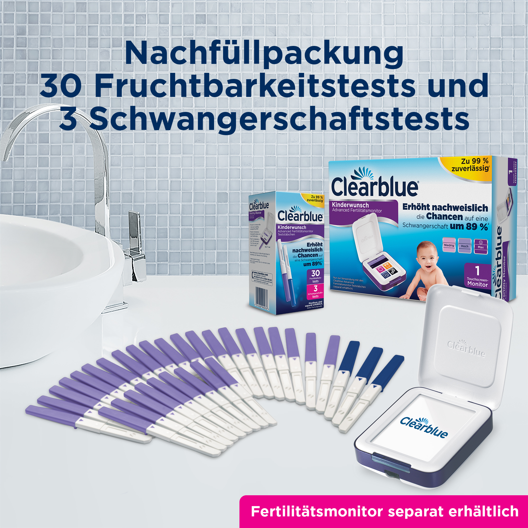 - 30 Fruchtbarkeitstests und 3 Schwangerschaftstests für die Verwendung mit dem Clearblue Fertilitätsmonitor Advanced. Bitte beachten Sie, dass der Monitor NICHT in diesem Paket enthalten ist, sondern separat erhältlich ist