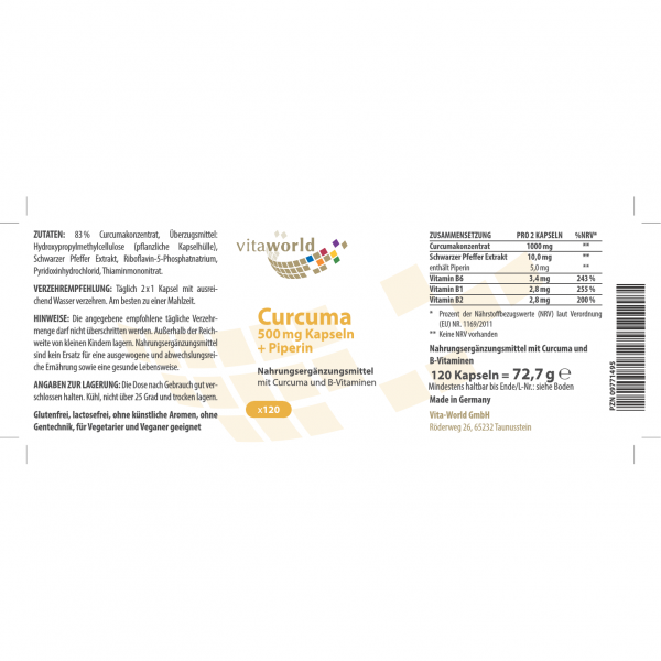 81,4 % Curcumakonzentrat, überzugsmittel: Hydroxypropylmethylcellulose (pflanzliche Kapselhülle), Trennmittel: Magnesiumsalze der Speisefettsäuren, Siliciumdioxid, Schwarzer Pfeffer Extrakt, Riboflavin-5-Phosphat, Pyridoxin HCL, Thiaminmononitrat