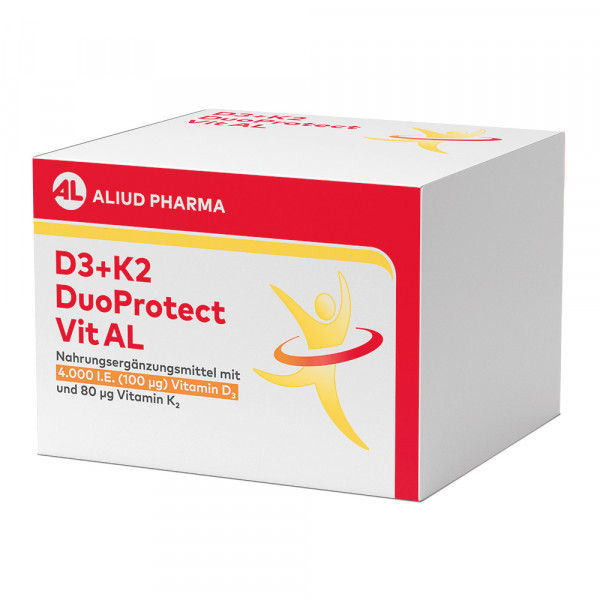 in der dunklen Jahreszeit ist die körpereigene Produktion des wertvollen „Sonnenvitamins“ in unseren Breitengraden jedoch erschwert. Um eine ausreichende Versorgung mit Vitamin D zu erreichen, können Nahrungsergänzungsmittel eingenommen werden. Die tägliche Einnahme von nur 1 Kapsel D3+K2 DUOPROTECT VIT AL kann zur täglichen Nahrungsergänzung ausreichend sein und einer Unterversorgung entgegenwirken. Zusätzlich enthält das Nahrungsergänzungsmittel Vitamin K2, das zur Aktivierung von Osteocalcin und damit zur Einbindung von Calcium in die Knochen