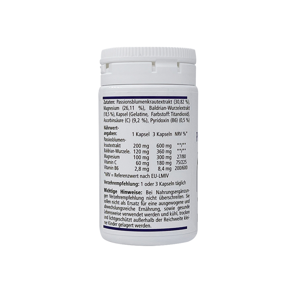 Zusammensetzung/Kapsel: Passionsblumenkrautextrakt (30,82 %), Magnesium (26,11 %), Baldrian-Wurzelextrakt (18,5 %), Kapsel (Gelatine, Farbstoff: Titandioxid), Ascorbinsäure (C) (9,2 %), Pyridoxin (B6) (0,5 %)