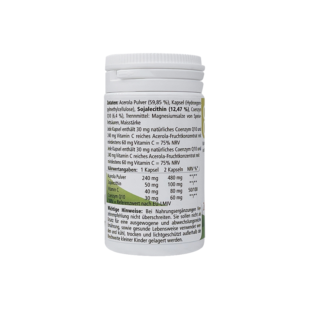 Zusammensetzung/Kapsel: Acerola-Fruchtpulver, Kapselmaterial Cellulose, Sojalecithin, Coenzym Q10 (30 mg), Trennmittel: Magnesiumsalze von Speisefettsäuren, Maisstärke