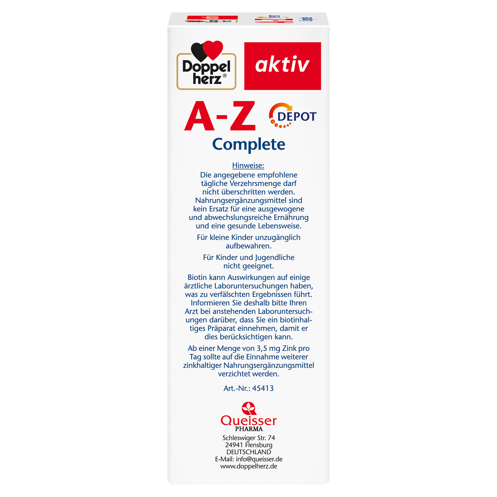 DoppelherzNahrungsergänzungsmittel sind kein Ersatz für eine ausgewogene und abwechslungsreiche Ernährung und eine gesunde Lebensweise. Die angegebene empfohlene tägliche Verzehrsmenge darf nicht überschritten werden. Außerhalb der Reichweite von kleinen Kindern aufbewahren.