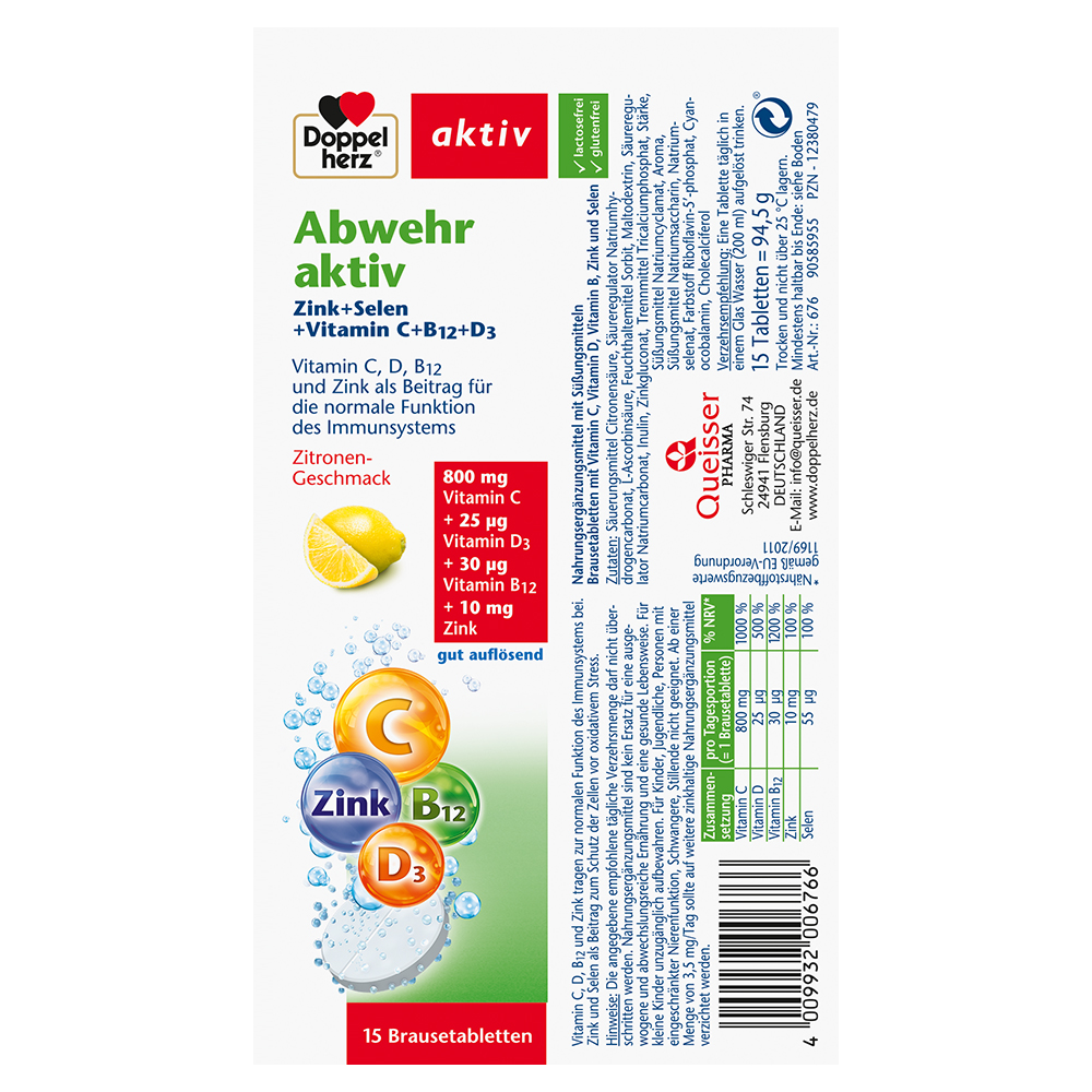 Nicht nur in der nasskalten Jahreszeit gilt es, die Abwehrkräfte zu unterstützen! Eine ausgewogene Ernährung und insbesondere die Versorgung mit speziellen Vitaminen und Spurenelementen spielt hier eine bedeutende Rolle. Das Doppelherz Nahrungsergänzungsmittel unterstützt mit den enthaltenen Mineralstoffen, Spurenelementen & Vitaminen die normale Funktion des Immunsystems und schmeckt lecker erfrischend nach Zitrone. Die Spurenelemente Zink und Selen sowie Vitamin C tragen zur normalen Funktion des Immunsystems und außerdem zum Schutz der Zellen vor oxidativem Stress bei. Zudem ist Zink auch an der Zellteilung beteiligt. Selen unterstützt zusätzlich die normale Schilddrüsenfunktion. Die lebenswichtigen Spurenelemente Zink und Selen kann der Körper nicht selbst bilden. Wir müssen sie regelmäßig und ausreichend über die Nahrung aufnehmen. Die Brausetabletten enthalten zusätzlich Vitamin D und Vitamin B12, welche abgesehen von der Unterstützung der Abwehrkräfte vielfältige weitere Aufgaben im Körper erfüllen: So unterstützt Vitamin D den normalen Knochenerhalt, und Vitamin B12 unterstützt den normalen Energiestoffwechsel und die normale Funktion des Nervensystems.