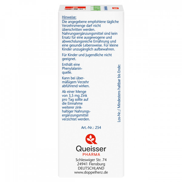 DoppelherzNahrungsergänzungsmittel sind kein Ersatz für eine ausgewogene und abwechslungsreiche Ernährung und eine gesunde Lebensweise. Die angegebene empfohlene tägliche Verzehrsmenge darf nicht überschritten werden. Außerhalb der Reichweite von kleinen Kindern aufbewahren.
