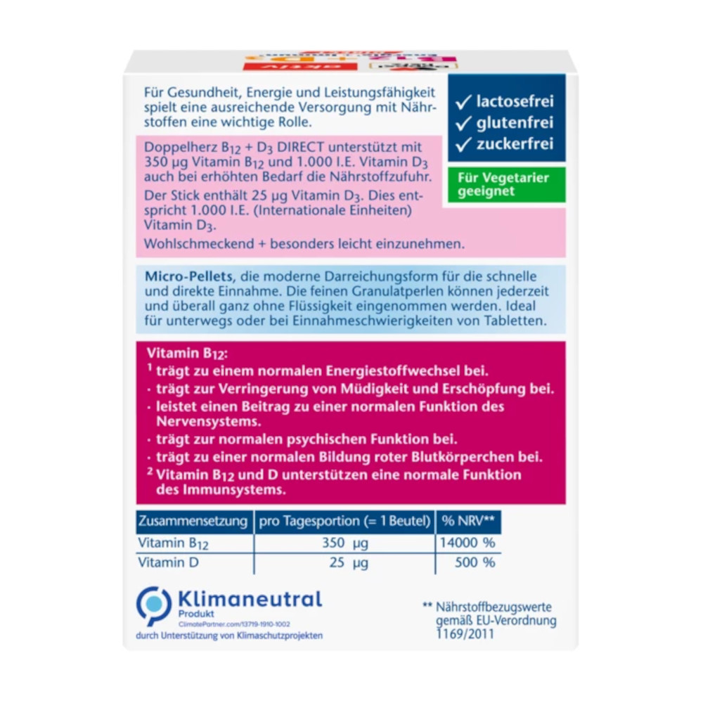 Doppelherz B12 + D3 DIRECT enthält Vitamin B12 für den Energiestoffwechsel und Vitamin D für die normale Funktion des Immunsystems. Ein Stick enthält 25 μg Vitamin D3. Dies entspricht 1.000 I.E. (Internationale Einheiten) Vitamin D3. Die Granulatperlen sind gluten- und lactosefrei.
