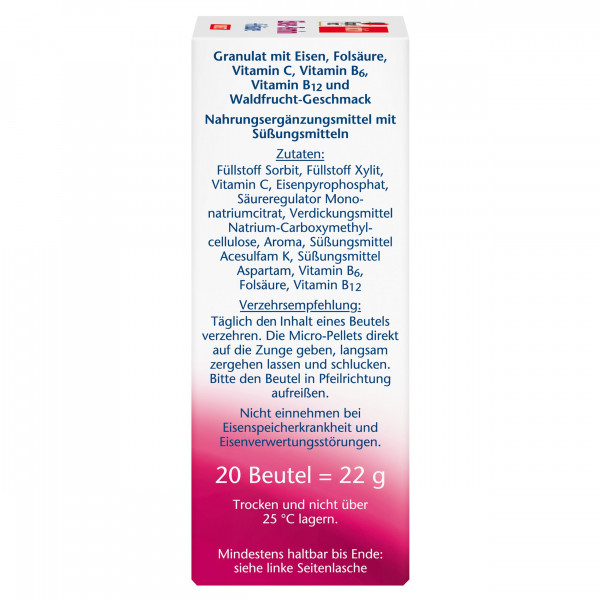 Das Spurenelement Eisen wird für viele Funktionen des Körpers benötigt. Da der Organismus selbst allerdings kein Eisen bilden kann, ist es wichtig, dass wir genügend eisenhaltige Nahrung zu uns nehmen. Die Micro-Pellets von Doppelherz enthalten 14 mg Eisen. Eisen unterstützt den Energiestoffwechsel und trägt zur normalen Bildung von roten Blutkörperchen bei. Das enthaltene Vitamin C steigert die Aufnahme von Eisen und unterstützt zudem die normale Funktion des Immunsystems. Die Vitamine B6 und B12 leisten darüber hinaus einen Beitrag zum normalen Energiestoffwechsel. Die wohlschmeckenden Pellets mit Waldfrucht-Geschmack können ganz ohne Wasser direkt auf die Zunge gegeben und geschluckt werden. Schnell und einfach auch für unterwegs!