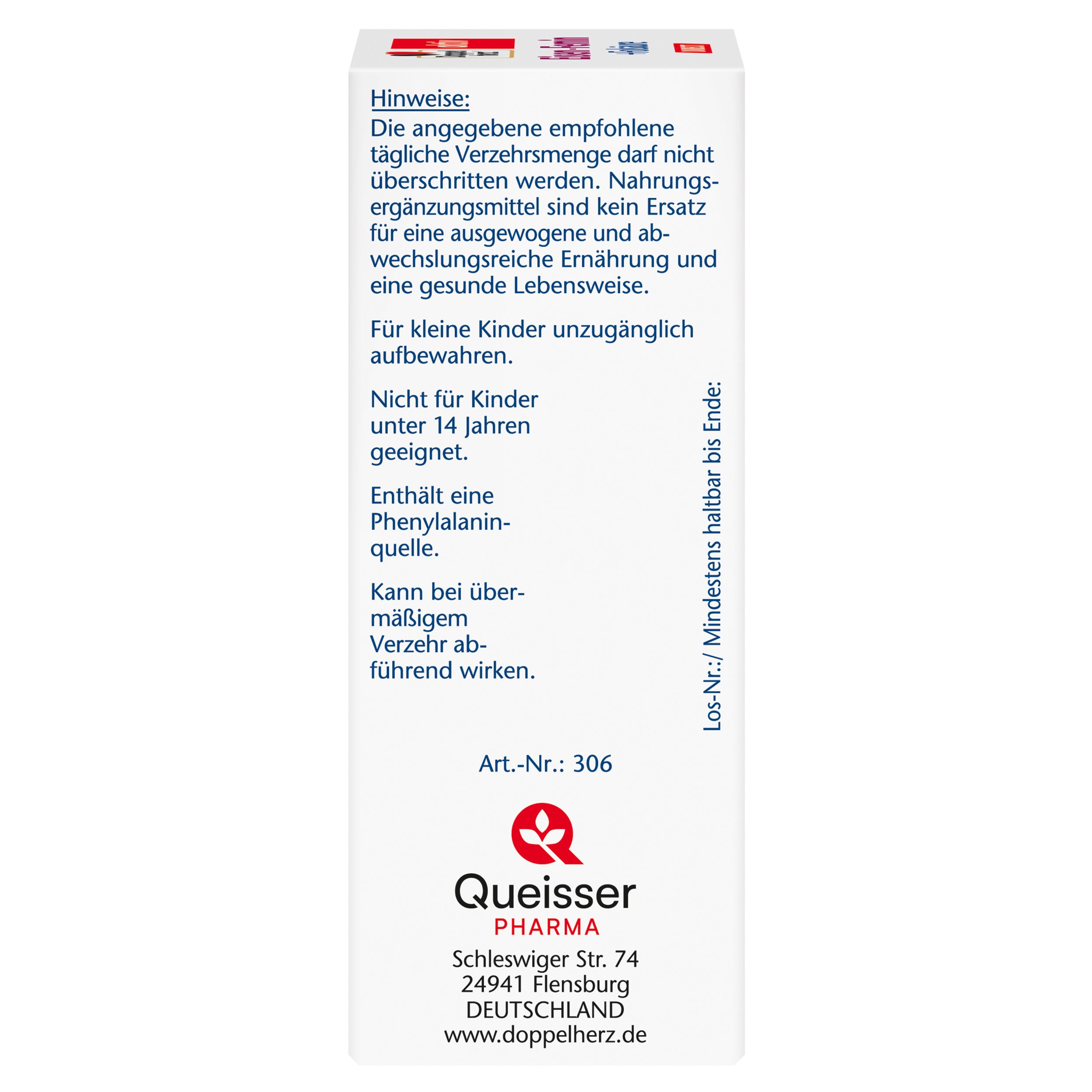 DoppelherzNahrungsergänzungsmittel sind kein Ersatz für eine ausgewogene und abwechslungsreiche Ernährung und eine gesunde Lebensweise. Die angegebene empfohlene tägliche Verzehrsmenge darf nicht überschritten werden. Außerhalb der Reichweite von kleinen Kindern aufbewahren.