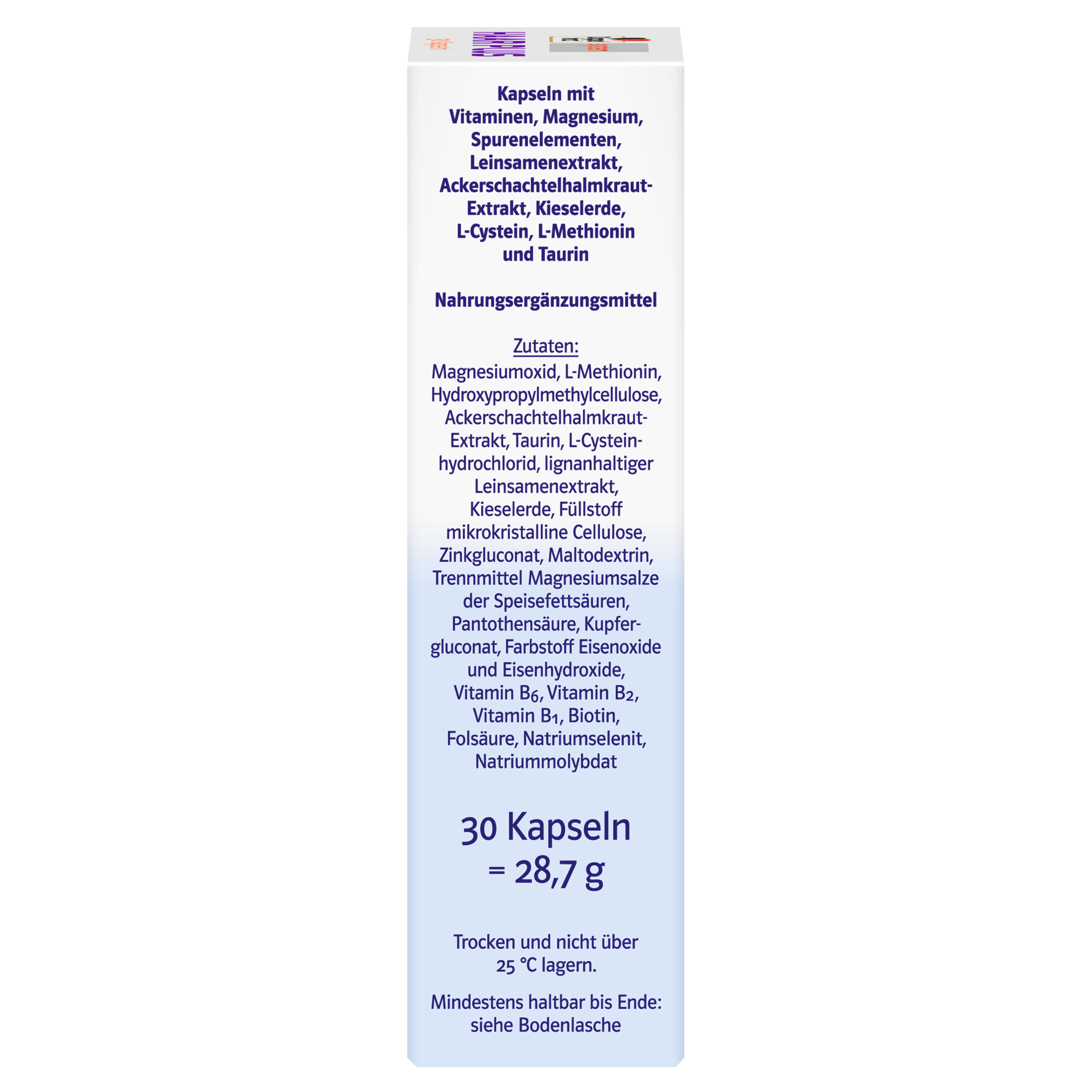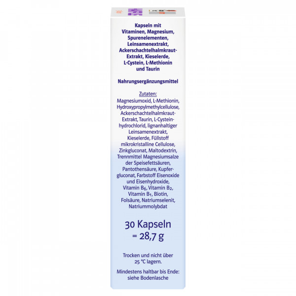 Magnesiumoxid, L-Methionin, Hydroxypropylmethylcellulose, Ackerschachtelhalmkraut-Extrakt, Taurin, L-Cysteinhydrochlorid, lignanhaltiger Leinsamenextrakt, Kieselerde, Füllstoff mikrokristalline Cellulose, Zinkgluconat, Maltodextrin, Trennmittel Magnesiumsalze der Speisefettsäuren, Pantothensäure, Kupfergluconat, Farbstoff Eisenoxide und Eisenhydroxide, Vitamin B6, Vitamin B2, Vitamin B1, Biotin, Folsäure, Natriumselenit, Natriummolybdat