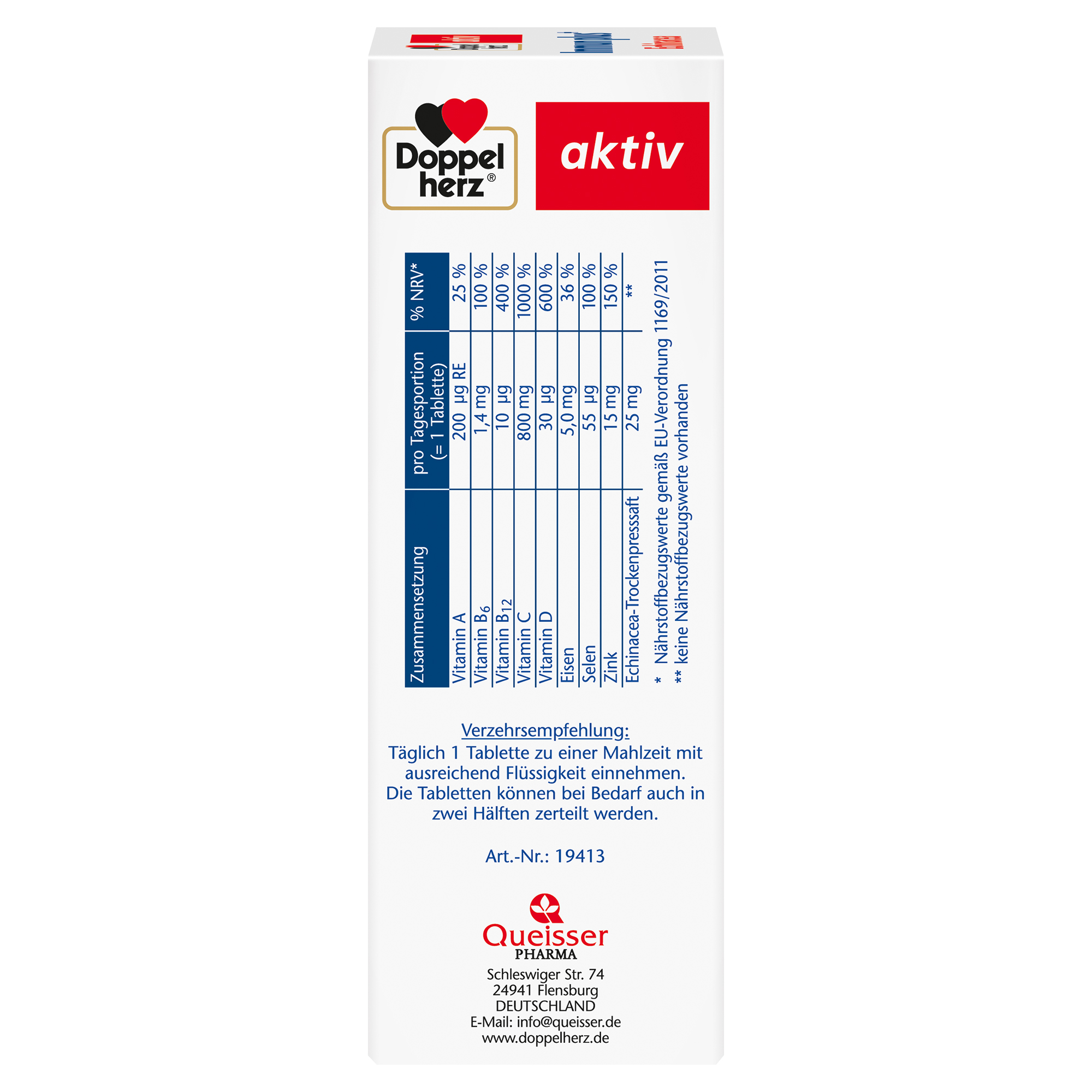 DoppelherzNahrungsergänzungsmittel sind kein Ersatz für eine ausgewogene und abwechslungsreiche Ernährung und eine gesunde Lebensweise. Die angegebene empfohlene tägliche Verzehrsmenge darf nicht überschritten werden. Außerhalb der Reichweite von kleinen Kindern aufbewahren.