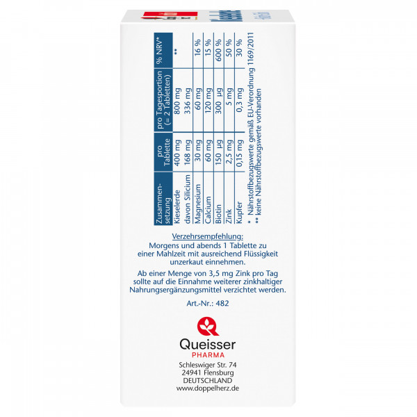 Gesunde Haut, schönes Haar, feste Fingernägel und ein gesundes Bindegewebe sind der Wunsch vieler Menschen. Dabei spielt auch eine ausreichende Versorgung mit lebensnotwendigen Nährstoffen eine wichtige Rolle. Da der Körper Spurenelemente, Mineralstoffe und Vitamine nicht selbst bilden kann, müssen diese mit der Nahrung ausreichend zugeführt werden. Bei einer unausgewogenen Ernährung ist die Versorgung mit diesen Nährstoffen jedoch nicht immer optimal. Kieselerde bildet die natürliche Basis für die Tabletten von Doppelherz und enthält als wesentlichen Bestandteil Silicium. Biotin trägt zur Erhaltung normaler Haut und Haare bei. Zink unterstützt die normale Funktion des Immunsystems und trägt dazu bei, die Zellen vor oxidativem Stress zu schützen. Das wichtige Spurenelement leistet wie Biotin einen Beitrag für den Erhalt normaler Haut und Haare. Es trägt zusätzlich zum Erhalt normaler Nägel bei. Das Spurenelement Kupfer leistet einen Beitrag zur Aufrechterhaltung des normalen Bindegewebes und unterstützt die normale Haarfarbe (Haarpigmentierung). Calcium ist ein lebensnotwendiger Mineralstoff, der für den Erhalt normaler Knochen benötigt wird und eine Funktion bei der Zellteilung hat. Magnesium leistet einen Beitrag zum Energiestoffwechsel und zur normalen Muskelfunktion.