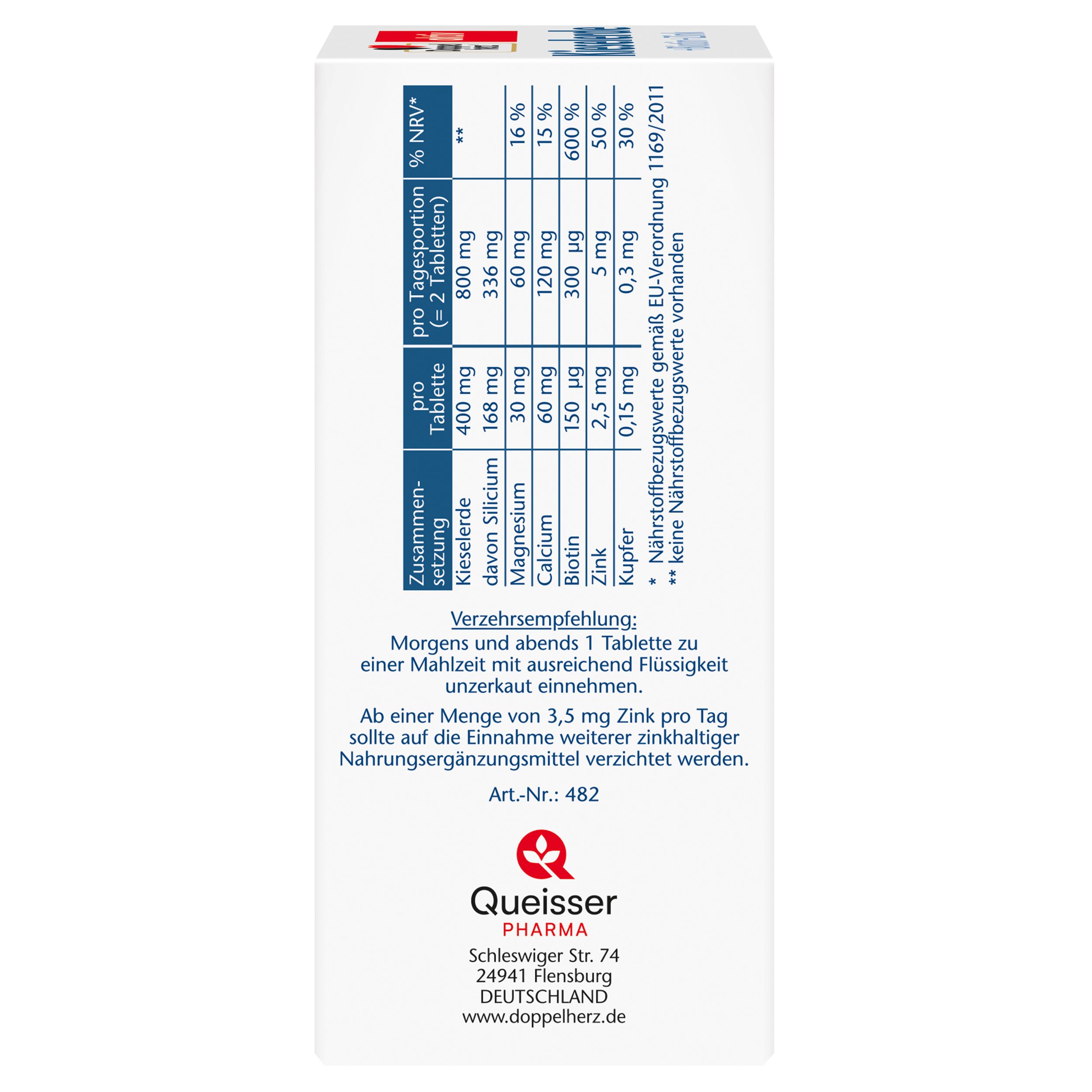 DoppelherzNahrungsergänzungsmittel sind kein Ersatz für eine ausgewogene und abwechslungsreiche Ernährung und eine gesunde Lebensweise. Die angegebene empfohlene tägliche Verzehrsmenge darf nicht überschritten werden. Außerhalb der Reichweite von kleinen Kindern aufbewahren.