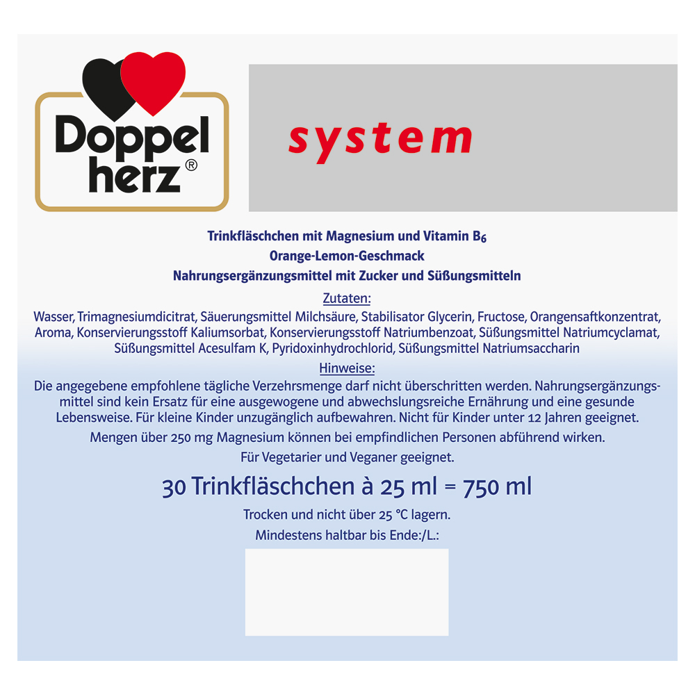 DoppelherzNahrungsergänzungsmittel sind kein Ersatz für eine ausgewogene und abwechslungsreiche Ernährung und eine gesunde Lebensweise. Die angegebene empfohlene tägliche Verzehrsmenge darf nicht überschritten werden. Außerhalb der Reichweite von kleinen Kindern aufbewahren.