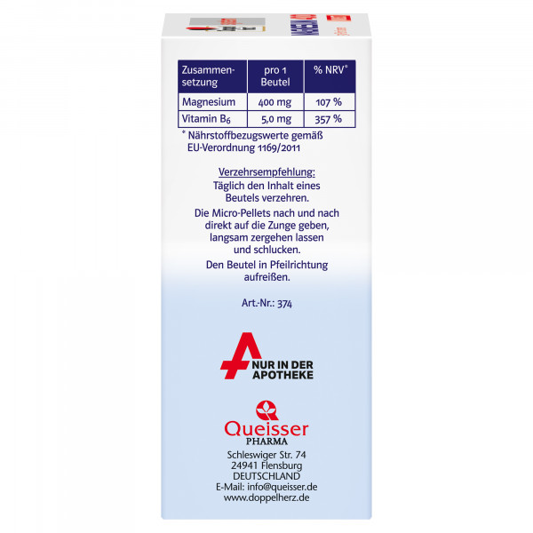 DoppelherzNahrungsergänzungsmittel sind kein Ersatz für eine ausgewogene und abwechslungsreiche Ernährung und eine gesunde Lebensweise. Die angegebene empfohlene tägliche Verzehrsmenge darf nicht überschritten werden. Außerhalb der Reichweite von kleinen Kindern aufbewahren.