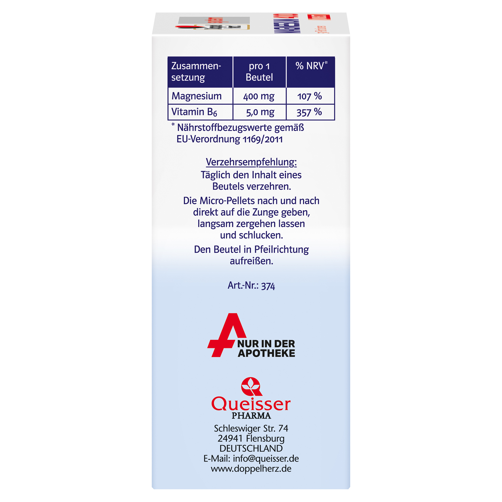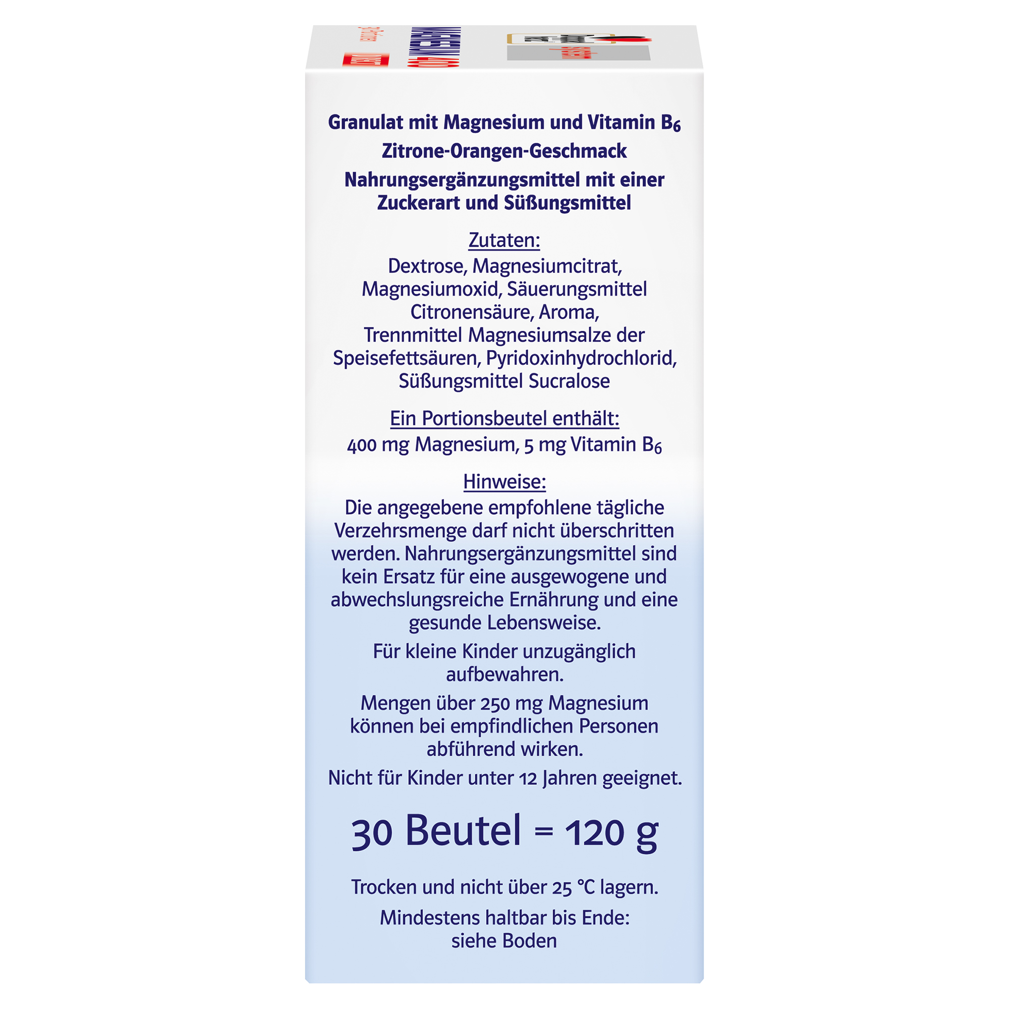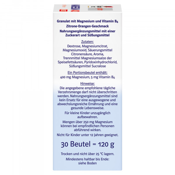 • 400 mg Magnesium, davon 200 mg aus Magnesium-Citrat, pro Portionsbeutel kombiniert mit 5 mg Vitamin B6