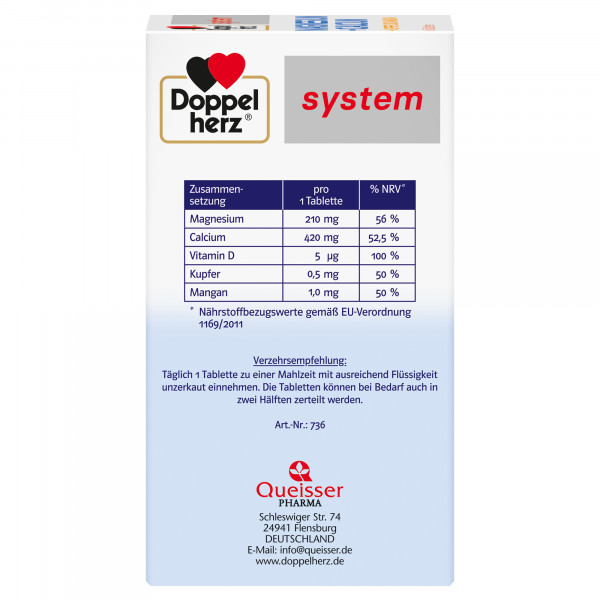 DoppelherzNahrungsergänzungsmittel sind kein Ersatz für eine ausgewogene und abwechslungsreiche Ernährung und eine gesunde Lebensweise. Die angegebene empfohlene tägliche Verzehrsmenge darf nicht überschritten werden. Außerhalb der Reichweite von kleinen Kindern aufbewahren.