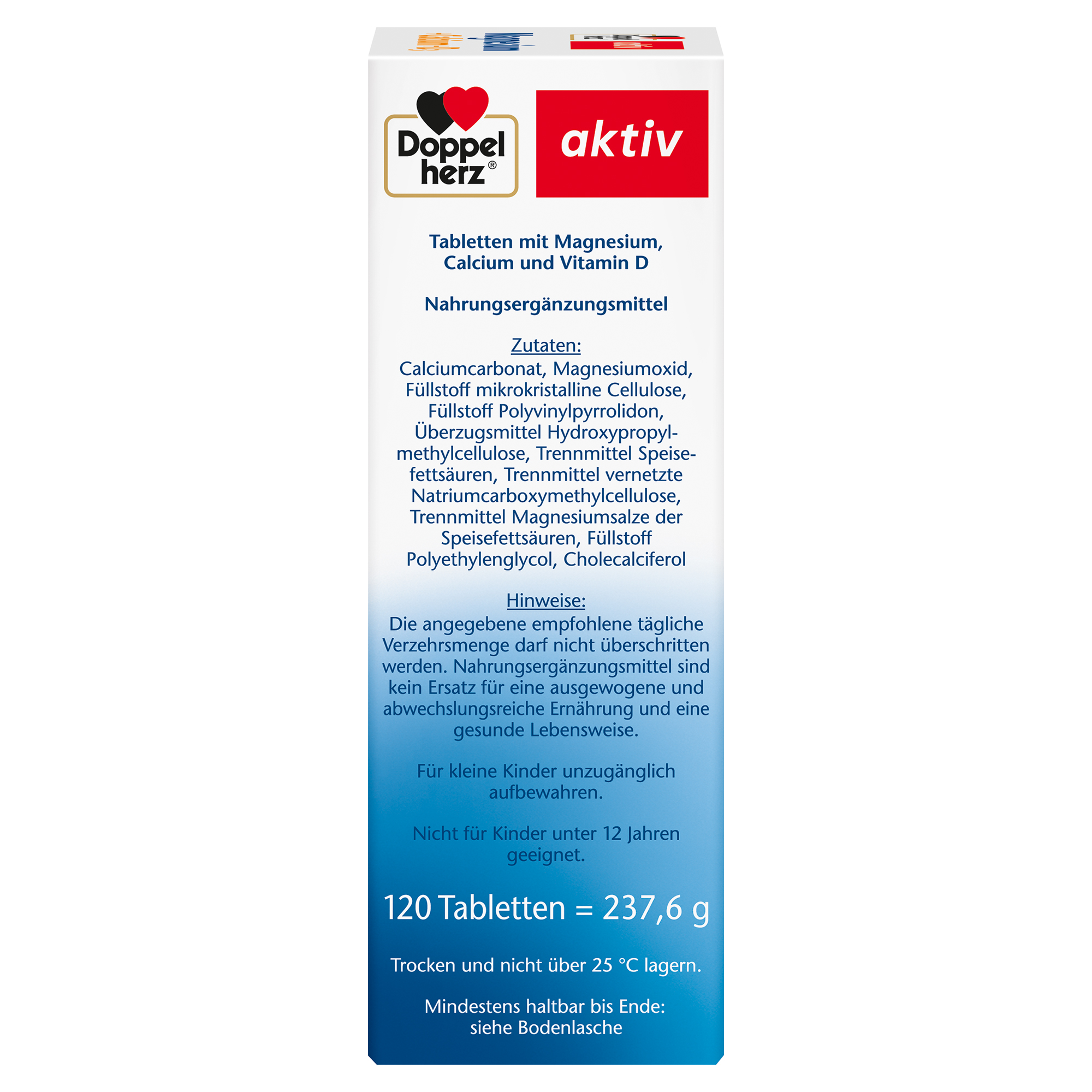 DoppelherzNahrungsergänzungsmittel sind kein Ersatz für eine ausgewogene und abwechslungsreiche Ernährung und eine gesunde Lebensweise. Die angegebene empfohlene tägliche Verzehrsmenge darf nicht überschritten werden. Außerhalb der Reichweite von kleinen Kindern aufbewahren.