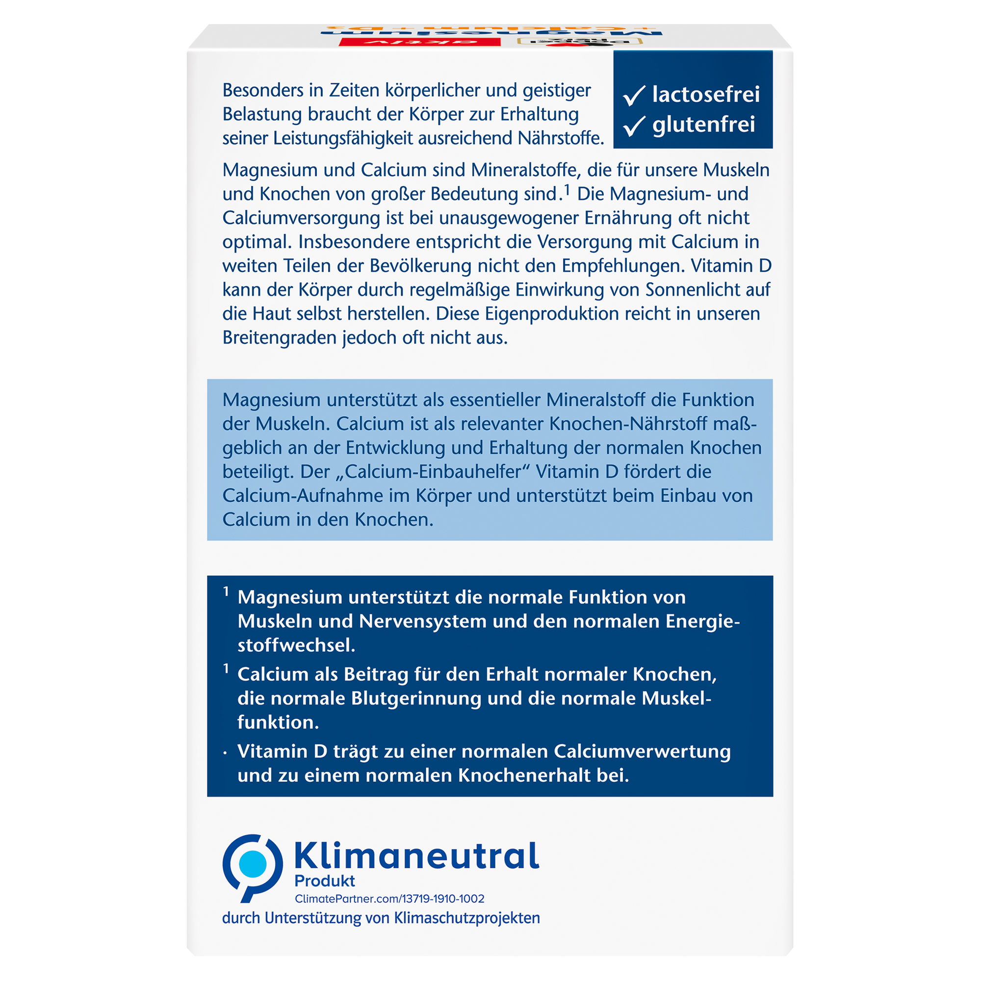 Besonders in Zeiten körperlicher und geistiger Belastung braucht der Körper zur Erhaltung seiner Leistungsfähigkeit ausreichend Nährstoffe. Magnesium und Calcium sind Mineralstoffe, die für die Leistungsfähigkeit unserer Muskeln und Knochen von großer Bedeutung sind. Die Magnesium- und Calciumversorgung ist bei unausgewogener Ernährung oft nicht optimal. Insbesondere entspricht die Versorgung mit Calcium in weiten Teilen der Bevölkerung nicht den Empfehlungen. Vitamin D kann der Körper durch regelmäßige Einwirkung von Sonnenlicht auf die Haut selbst herstellen. Diese Eigenproduktion reicht in unseren Breitengraden jedoch oft nicht aus. Magnesium unterstützt als essentieller Mineralstoff die Funktion der Muskeln. Calcium ist als relevanter Knochennährstoff maßgeblich an der Entwicklung und Erhaltung der Knochen beteiligt. Der "Calciumeinbauhelfer" Vitamin D fördert die Calcium-Aufnahme im Körper und unterstützt beim Einbau von Calcium in den Knochen. Magnesium unterstützt die normale Funktion von Muskeln und Nervensystem und den normalen Energiestoffwechsel. Calcium trägt zum Erhalt normaler Knochen, einer normalen Blutgerinnung und einer normale Muskelfunktion bei. Vitamin D trägt zu einer normalen Calciumverwertung und zu einem normalen Knochenerhalt bei.