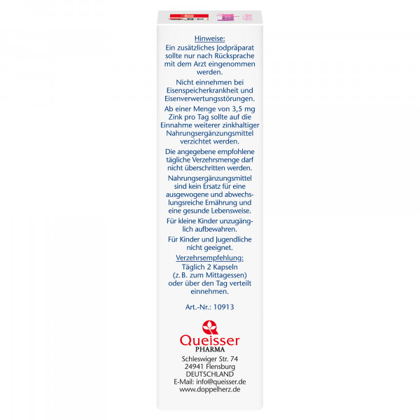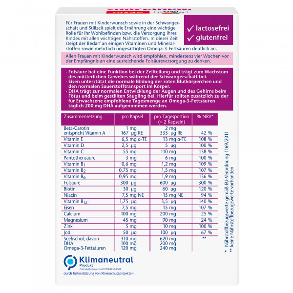 In der Schwangerschaft und Stillzeit oder bei Kinderwunsch muss der Körper mit ausreichend Nährstoffen für Mutter und Kind versorgt werden. Eine ausgewogene Ernährung spielt in dieser Lebensphase eine wichtige Rolle. Die Kapseln von Doppelherz liefern pro Tagesportion (2 Kapseln) 600 µg Folsäure, B-Vitamine, Calcium, Magnesium, Eisen, Zink und Jod. Folsäure ist ein lebensnotwendiges Vitamin und hat eine Funktion bei der Zellteilung und trägt zum Wachstum des mütterlichen Gewebes während der Schwangerschaft bei. Jod spielt eine Rolle für die normale Produktion der Schilddrüsenhormone, die wichtige Aufgaben im Stoffwechsel erfüllen. Eisen unterstützt die normale Bildung der roten Blutkörperchen und den normalen Sauerstofftransport im Körper. Der Bedarf erhöht sich in der Schwangerschaft um das Doppelte. Zink leistet einen Beitrag zur normalen Funktion des Immunsystems und zum Schutz der Zellen vor oxidativem Stress. Magnesium trägt zum normalen Energiestoffwechsel und zur normalen Funktion des Nervensystems und der Muskeln bei.