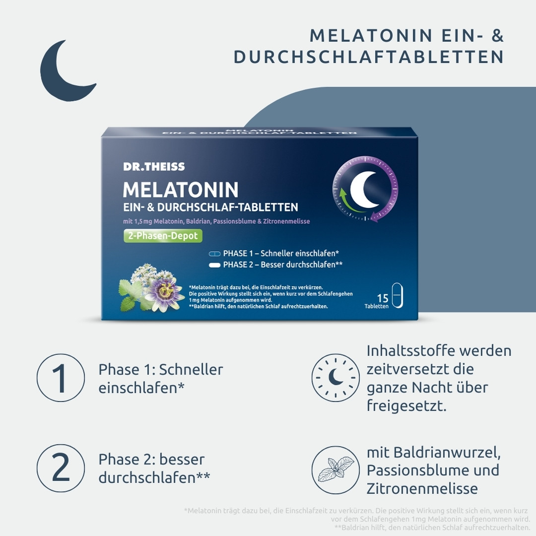 Vertrauen Sie bei Schlafproblemen auf DR. THEISS – Die meistverkauften Melatonin-Produkte in der deutschen Apotheke*. DR. THEISS Melatonin Ein- & Durchschlaf-Tabletten sind ein Nahrungsergänzungsmittel mit Melatonin und Extrakten aus Baldrianwurzel, Passionsblume und Zitronenmelisse. Melatonin ist ein natürlich vorkommendes Hormon, das von der Zirbeldrüse in unserem Gehirn produziert wird. Es spielt eine wichtige Rolle bei der Regulation unseres Schlaf-Wach-Zyklus. Melatonin wird oft als Einschlafhilfe verwendet, um Menschen dabei zu helfen, besser einzuschlafen und durchzuschlafen. Stressige Lebensphasen, Schicht- und Nachtarbeit oder lange Flugreisen über mehrere Zeitzonen hinweg, können zu Schlafproblemen führen. Für viele Menschen, die unter Schlafstörungen leiden, kann Melatonin eine effektive Lösung sein. Schlafstörungen können verschiedene Formen annehmen, wie zum Beispiel Schwierigkeiten beim Einschlafen, häufiges Aufwachen während der Nacht oder das Gefühl von nicht erholsamem Schlaf. In solchen Fällen kann die Einnahme von Melatonin z. B. in Form von Ein- & Durchschlaf-Tabletten helfen, den Schlaf-Wach-Rhythmus zu regulieren und die Schlafqualität zu verbessern. Erholsamer Schlaf ist wichtig, um die körperliche und geistige Gesundheit sowie Leistungsfähigkeit zu erhalten. Während des Schlafs erholt sich unser Körper von den Aktivitäten des Tages und bereitet sich auf den nächsten Tag vor. Stressige Lebensphasen, Schicht- und Nachtarbeit können zu Einschlafproblemen führen. DR. THEISS Melatonin Ein- & Durchschlaf-Tabletten mit einem innovativen 2-Phasen-Freisetzungsprozess: 1. Phase (schneller einschlafen): 1 mg Melatonin* trägt dazu bei die Einschlafzeit zu verkürzen. Passionsblume und Zitronenmelisse können den Schlaf unterstützen und für Entspannung sorgen. 2. Phase (besser durchschlafen**): 0,5 mg Melatonin und Baldrianwurzel-Extrakt** werden zeitversetzt abgegeben. Baldrian unterstützt das Durchschlafen. • Nahrungsergänzungsmittel bei Schlafproblemen • Schneller einschlafen, besser durchschlafen • Schlaftabletten (Nahrungsergänzungsmittel) mit 2-Phasen-Freisetzungsprozess • Unterstützung des natürlichen Schlafzyklus • Mit Melatonin, Passionsblumen- und Baldrianextrakt und Zitronenmelisse. • Laktosefrei, zuckerarm und alkoholfrei • Vegan *Melatonin trägt dazu bei, die Einschlafzeit zu verkürzen. Die positive Wirkung stellt sich ein, wenn kurz vor dem Schlafengehen 1 mg Melatonin aufgenommen wird. **Baldrian hilft, den natürlichen Schlaf aufrechtzuerhalten.s