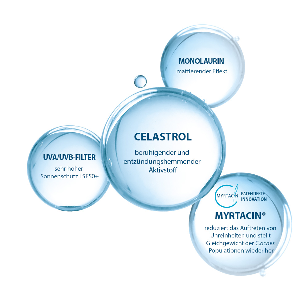 Keracnyl UV SPF 50+ Fluid gegen Hautunreinheiten bietet einen sehr hohen UVA-/UVB -Sonnenschutz für fettige oder zu Akne neigende Haut, und hilft Hautunreinheiten zu entfernen. Das Produkt ist für Jugendliche ab 12 Jahren und Erwachsene geeignet.