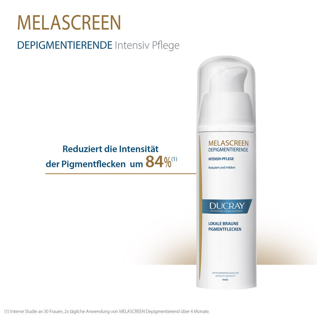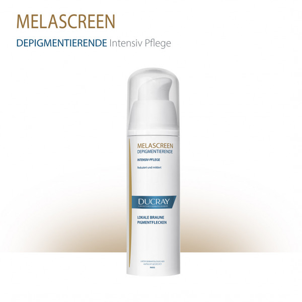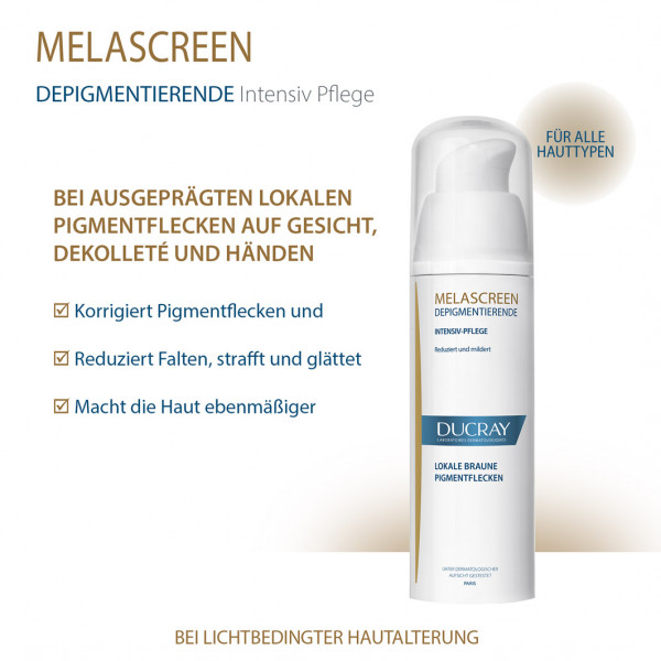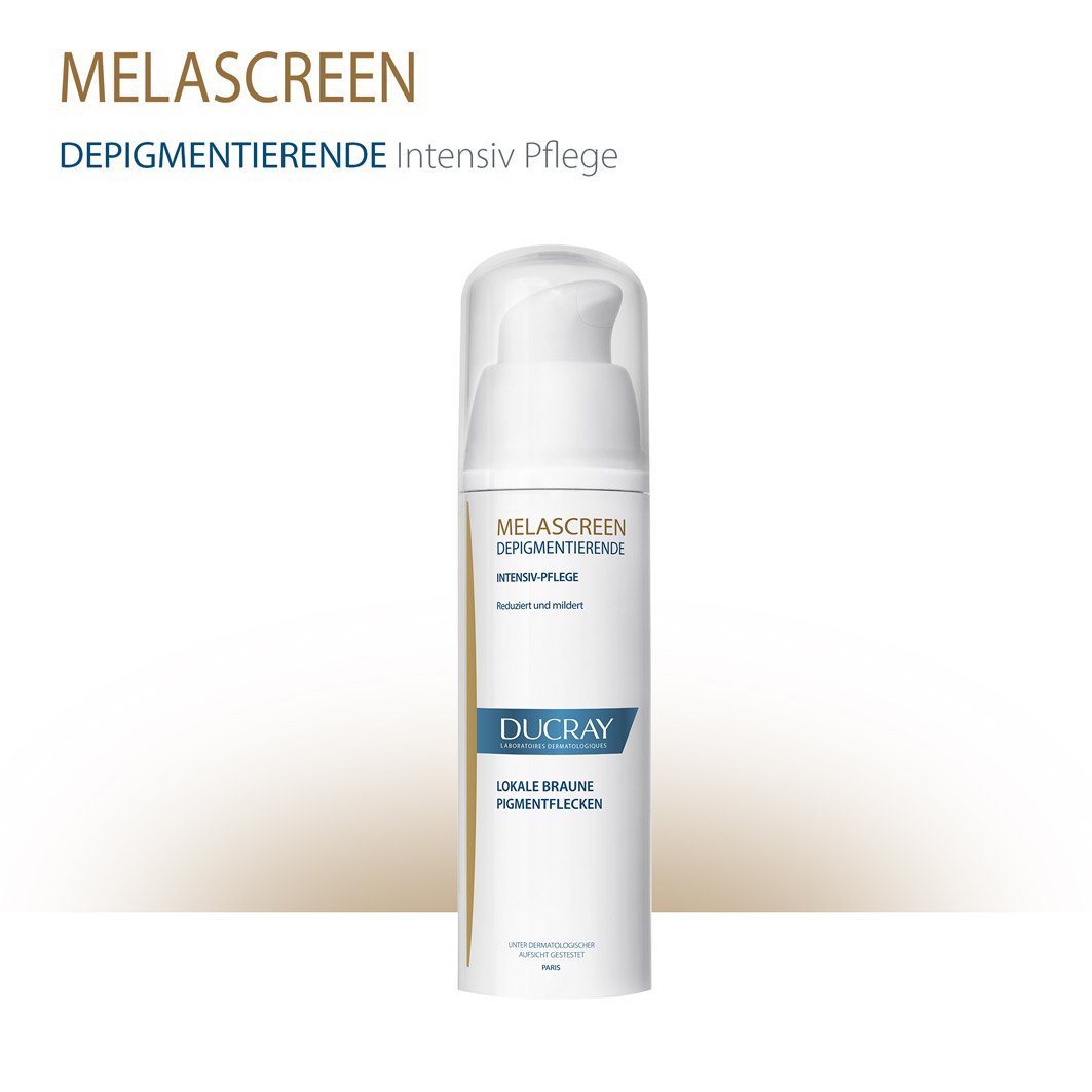 DUCRAY MELASCREEN Depigmentierende Gesichtspflege gegen lokal begrenzte Pigmentstörungen ist eine Intensivbehandlung mit einer hohen Konzentration an depigmentierenden Wirkstoffen wie Azelainsäure und Glycolsäure. Sie eignet sich für die topische Anwendung auf der Haut und wirkt gezielt gegen Pigmentstörungen auf Gesicht, Dekolleté und Händen.