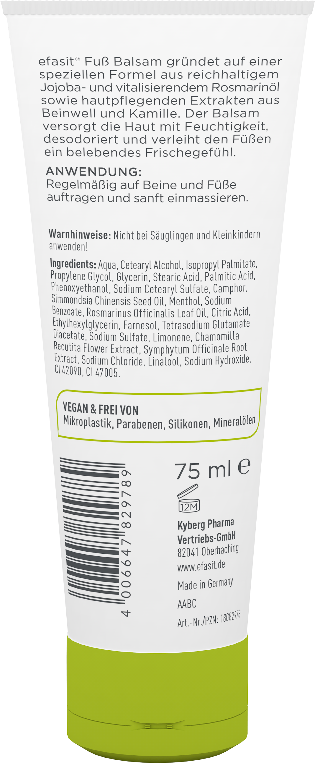 efasit® Fuß Balsam gründet auf einer speziellen Formel aus reichhaltigem Jojoba- und vitalisierendem Rosmarinöl sowie hautpflegenden und hautberuhigenden Extrakten aus Beinwell und Kamille. Der Balsam versorgt die Haut mit Feuchtigkeit, desodoriert und verleiht den Füßen ein belebendes Frischegefühl. Der Balsam wird zur täglichen Pflege, bei trockener Haut und vor oder nach einem langen Tag angewandt.